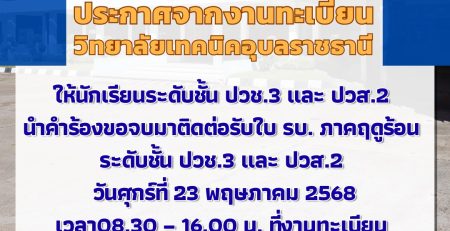 ประกาศวิทยาลัยเทคนิคอุบลราชธานี การผ่อนผันการเกณฑ์ทหาร ประจำปีการศึกษา ๒๕๖๘ (คนที่เกิดในปี พ.ศ.๒๕๔๘) ให้ยื่นเอกสารที่งานกิจกรรมนักเรียน นักศึกษา ตั้งแต่วันที่ (เพิ่มเติม…)