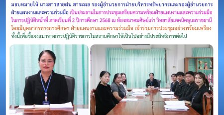 วันที่ 24 พฤศจิกายน 2568 เวลา 08.00 น. นายธาตรี พิบูลมณฑา ผู้อำนวยการวิทยาลัยเทคนิคอุบลราชธานี มอบหมายให้ นายไวพจน์ (เพิ่มเติม…)