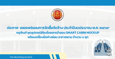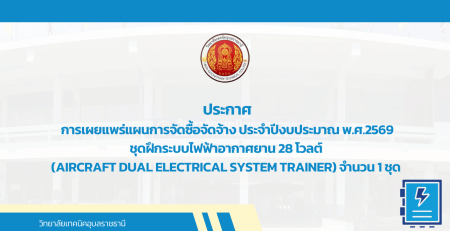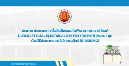 - ประกาศ ประกวดราคาซื้อชึดฝึกระบบไฟฟ้าอากาศยาน 28 โวลต์ (Aircraft Dual Electrical System Trainer) จำนวน 1 ชุด ด้วยวิธีประกวดราคาอิเล็กทรอนิกส์ (e-bidding)