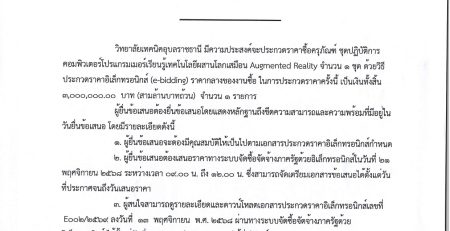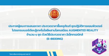 - ประกาศผู้ชนะการเสนอราคา ประกวดราคาซื้อครุภัณฑ์ ชุดปฏิบัติการคอมพิวเตอร์โปรแกรมเมอร์เรียนรู้เทคโนโลยีผสานโลกเสมือน Augmented Reality จำนวน ๑ ชุด ด้วยวิธีประกวดราคา อิเล็กทรอนิกส์ (e-bidding)