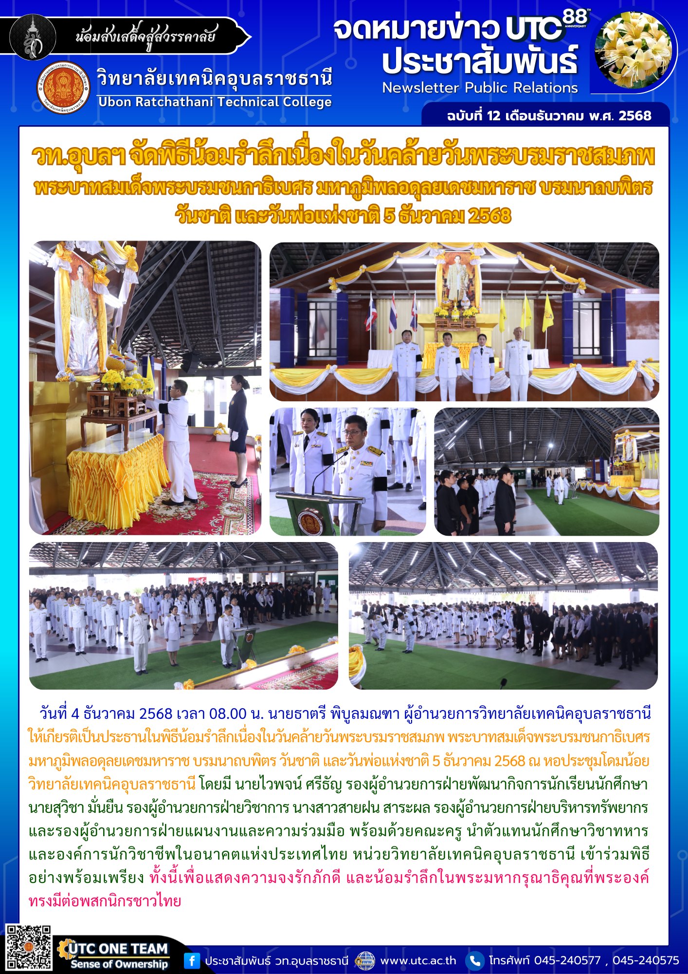 - วท.อุบลฯ จัดพิธีน้อมรำลึกเนื่องในวันคล้ายวันพระบรมราชสมภพ พระบาทสมเด็จพระบรมชนกาธิเบศร มหาภูมิพลอดุลยเดชมหาราช บรมนาถบพิตร วันชาติ และวันพ่อแห่งชาติ 5 ธันวาคม 2568