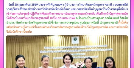 - วท.อุบลฯ ร่วมการประชุมเชิงปฏิบัติการพัฒนาศักยภาพอาจารย์และบุคลากรมหาวิทยาลัย เพื่อเฝ้าระวังปัญหาสุขภาพจิตนักศึกษาในมหาวิทยาลัย