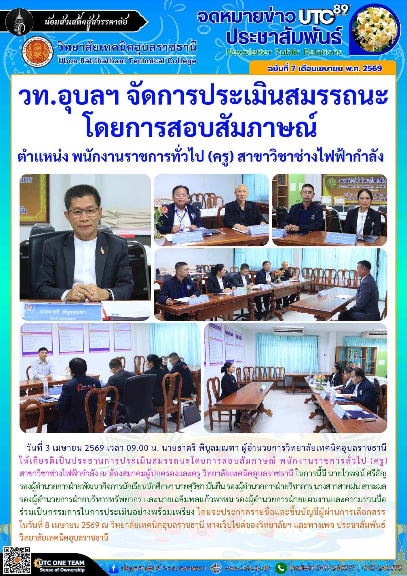 วันที่ 3 เมษายน 2569 เวลา 09.00 น. นายธาตรี พิบูลมณฑา ผู้อำนวยการวิทยาลัยเทคนิคอุบลราชธานี ให้เกียรติเป็นประธานการประเมินสมรรถนะโดยการสอบสัมภาษณ์ พนักงานราชการทั่วไป (ครู) สาขาวิชาช่างไฟฟ้า (เพิ่มเติม…) read more