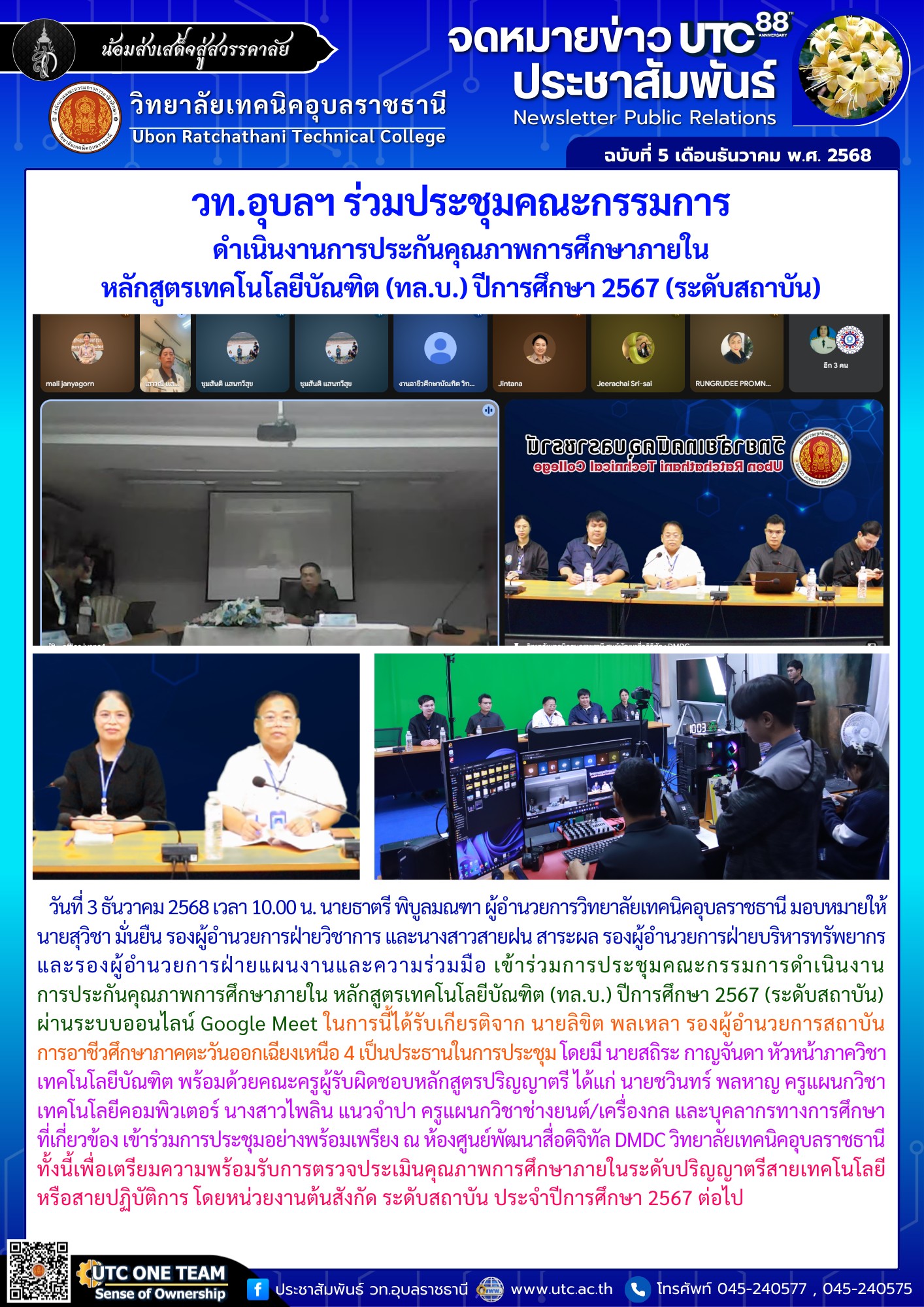 วท.อุบลฯ เข้าร่วมการประชุมคณะกรรมการดำเนินงานการประกันคุณภาพการศึกษาภายใน หลักสูตรเทคโนโลยีบัณฑิต (ทล.บ.) ปีการศึกษา 2567 (ระดับสถาบัน)