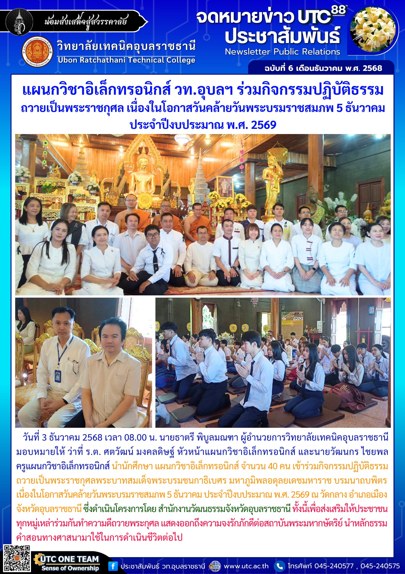 แผนกวิชาอิเล็กทรอนิกส์ วท.อุบลฯ เข้าร่วมกิจกรรมปฏิบัติธรรมถวายเป็นพระราชกุศล เนื่องในโอกาสวันคล้ายวันพระบรมราชสมภพ 5 ธันวา ประจำปีงบประมาณ พ.ศ. 2569