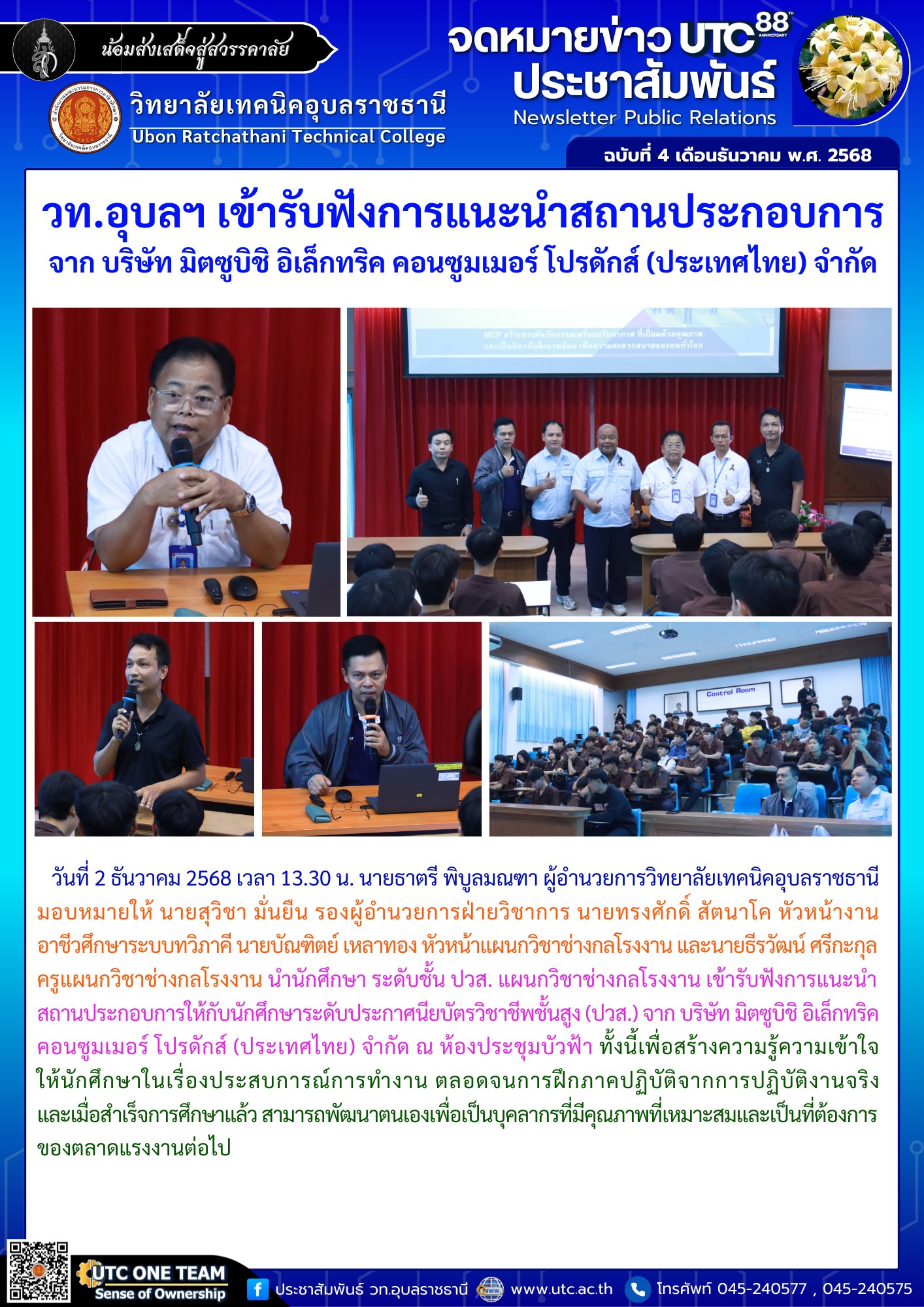 วท.อุบลฯ เข้ารับฟังการแนะนำสถานประกอบการ จาก บริษัท มิตซูบิชิ อิเล็กทริค คอนซูมเมอร์ โปรดักส์ (ประเทศไทย) จำกัด