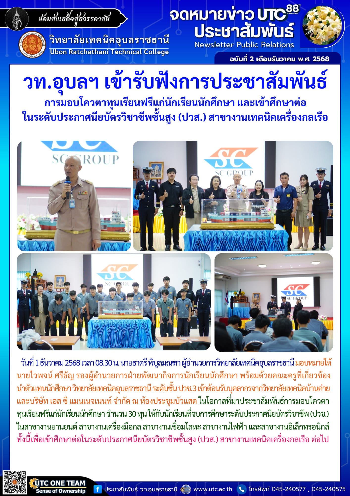 วท.อุบลฯ เข้ารับฟังการประชาสัมพันธ์ การมอบโควตาทุนเรียนฟรีแก่นักเรียนนักศึกษา เเละ เข้าศึกษาต่อในระดับประกาศนียบัตรวิชาชีพชั้นสูง (ปวส.) สาขางานเทคนิคเครื่องกลเรือ