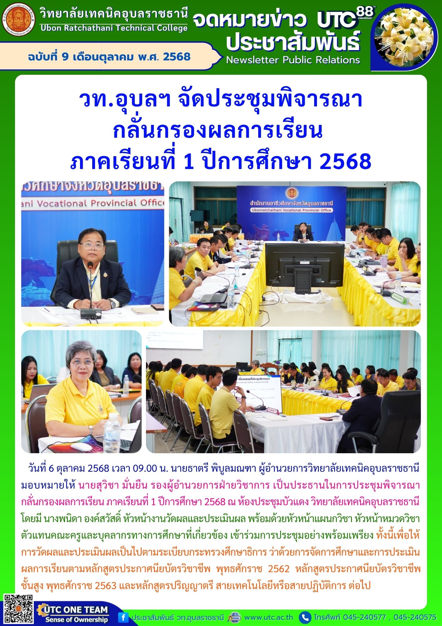 วันที่ 6 ตุลาคม 2568 เวลา 09.00 น. นายธาตรี พิบูลมณฑา ผู้อำนวยการวิทยาลัยเทคนิคอุบลราชธานี มอบหมายให้ นายสุวิชา มั่นยืน รองผู้อำนวยการฝ่ายวิชาการ เป็นประธานในการประชุมพิจารณากลั่นกรองผลการเรียน ภาคเรียนที่ 1 ปีการศึกษา (เพิ่มเติม…)