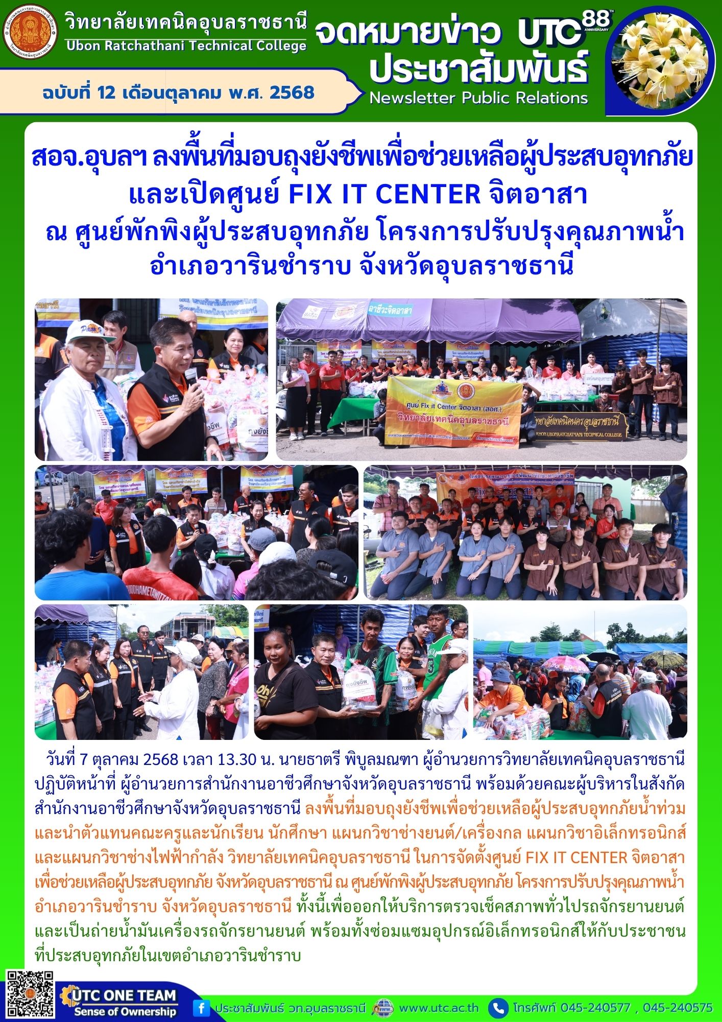 สอจ. ลงพื้นที่มอบถุงยังชีพเพื่อช่วยเหลือผู้ประสบอุทกภัย และจัดตั้งศูนย์ FIX IT CENTER จิตอาสา (ศูนย์ถาวร) เพื่อช่วยเหลือผู้ประสบอุทกภัย จังหวัดอุบลราชธานี