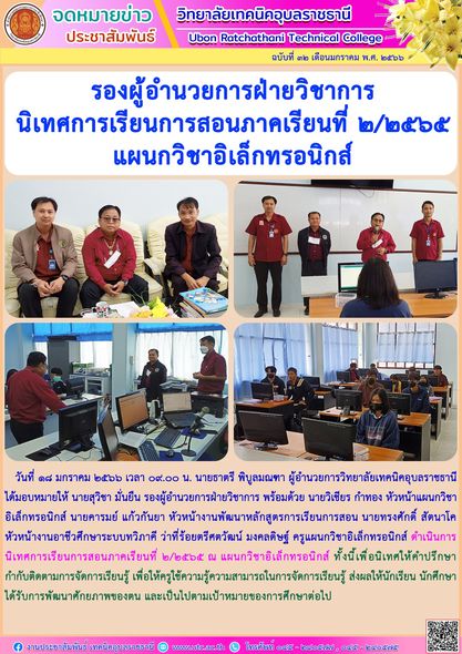 วันที่ ๑๘ มกราคม ๒๕๖๖ เวลา ๐๙.๐๐ น. นายธาตรี พิบูลมณฑา ผู้อำนวยการวิทยาลัยเทคนิคอุบลราชธานี (เพิ่มเติม…)