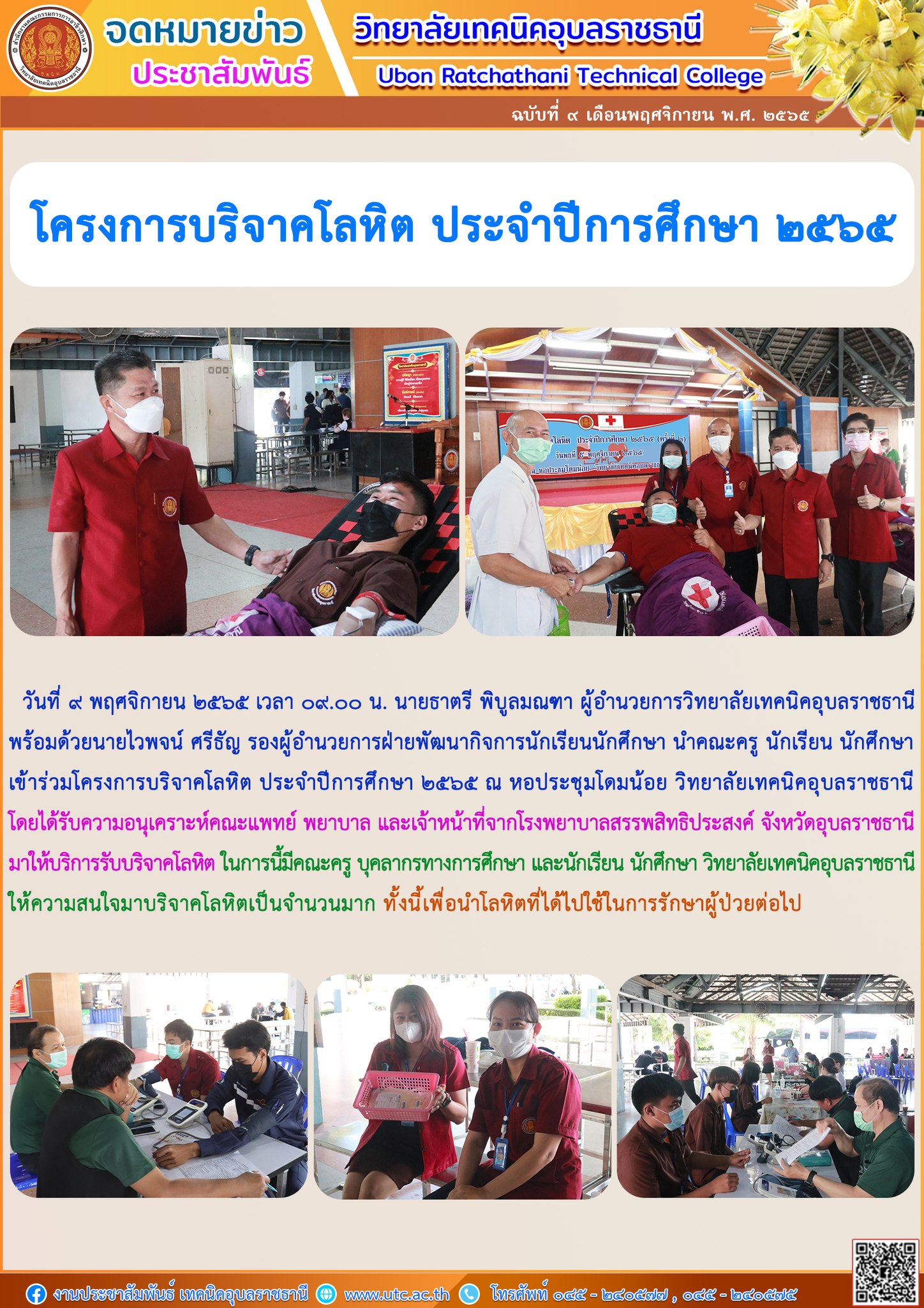 วันที่ ๙ พฤศจิกายน ๒๕๖๕ เวลา ๐๘.๓๐ น. นายธาตรี พิบูลมณฑา ผู้อำนวยการวิทยาลัยเทคนิคอุบลราชธานี ให้เกียรติเป็นตัวแทนกลุ่ม (เพิ่มเติม…)