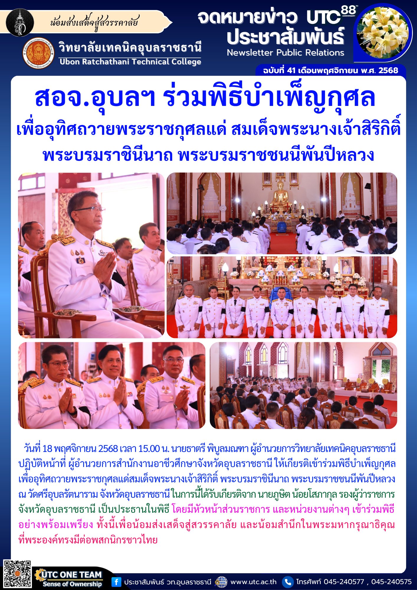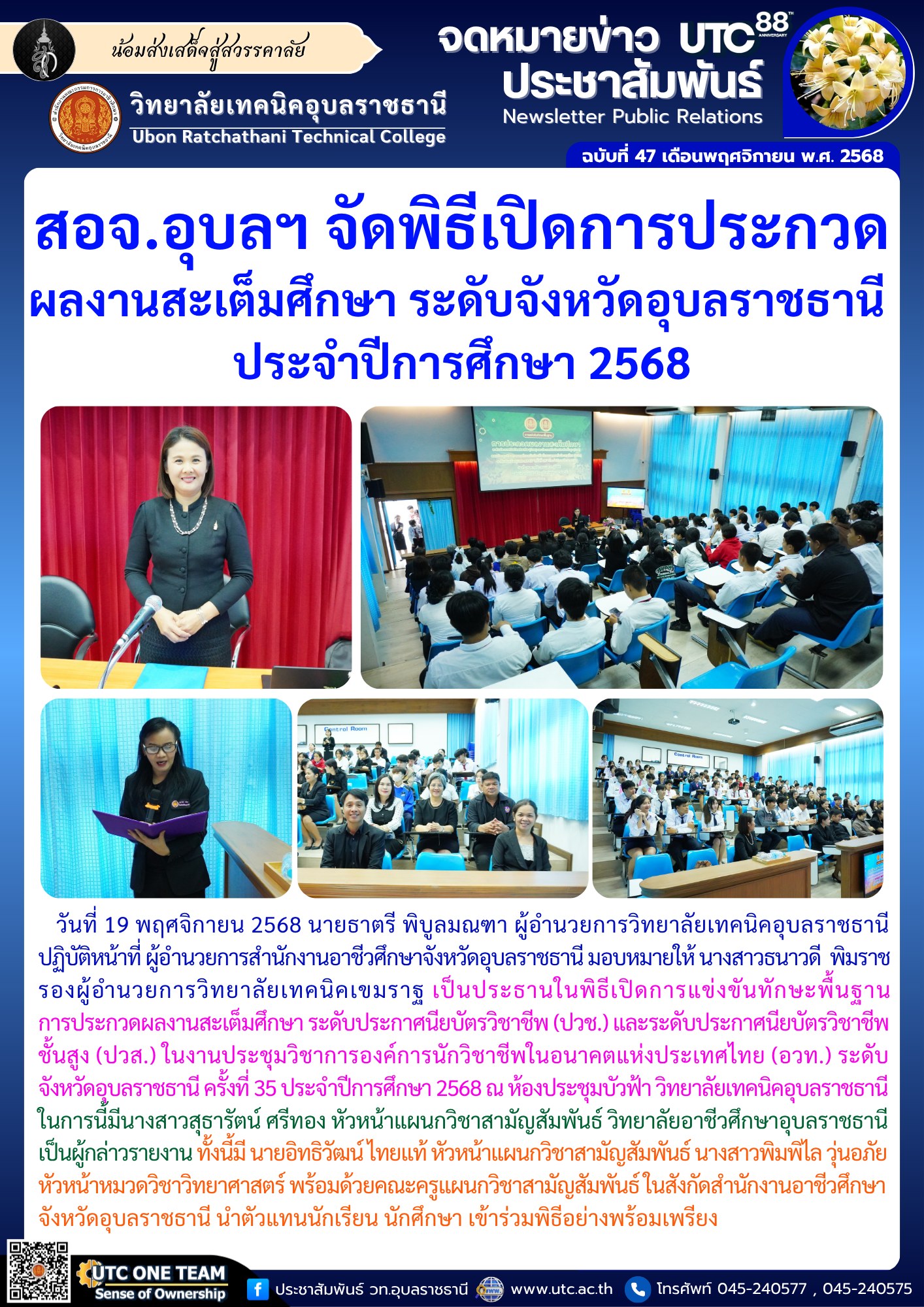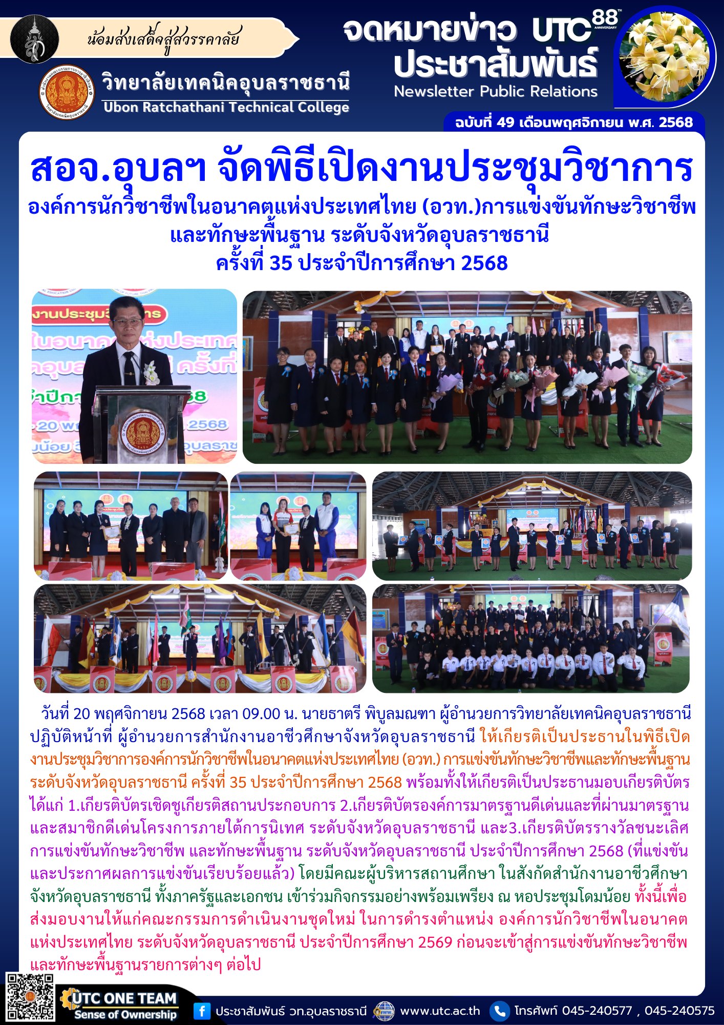 สอจ. อุบลฯ พิธีเปิดงานประชุมวิชาการองค์การนักวิชาชีพในอนาคตแห่งประเทศไทย (อวท.) การแข่งขันทักษะวิชาชีพและทักษะพื้นฐาน ระดับจังหวัดอุบลราชธานี ครั้งที่ 35 ประจำปีการศึกษา 2568
