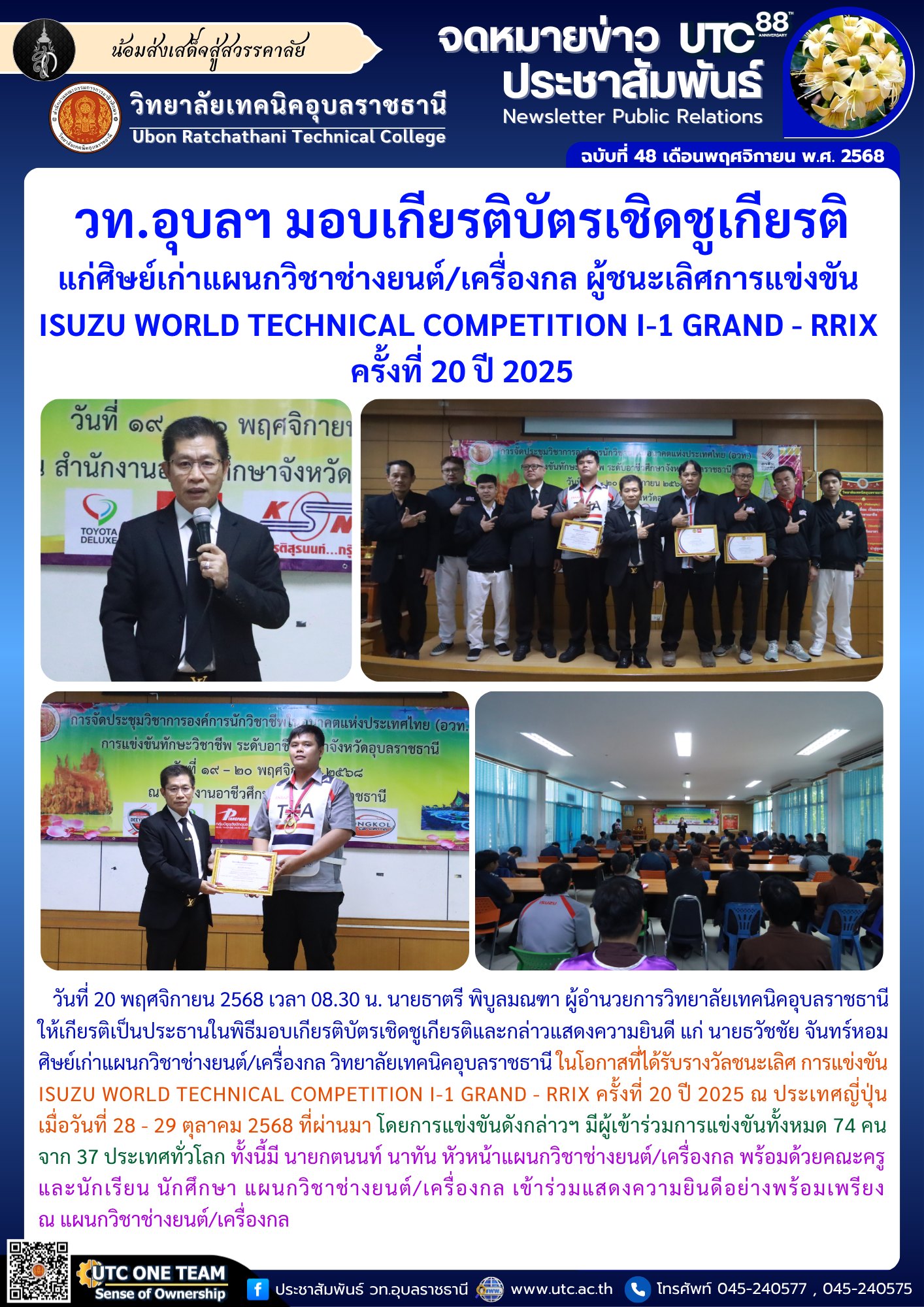 วันที่ 20 พฤศจิกายน 2568 เวลา 09.00 น. นายธาตรี พิบูลมณฑา ผู้อำนวยการวิทยาลัยเทคนิค (เพิ่มเติม…)