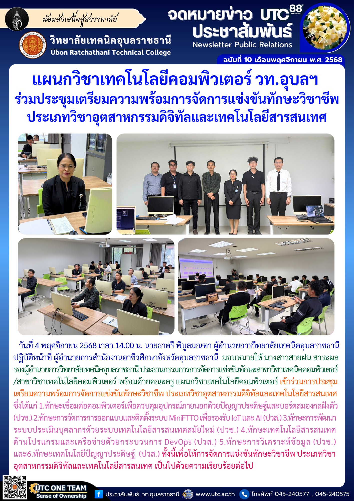 วันที่ 4 พฤศจิกายน 2568 เวลา 13.00 น. นายธาตรี พิบูลมณฑา ผู้อำนวยการวิทยาลัยเทคนิคอุบลราชธานี (เพิ่มเติม…)