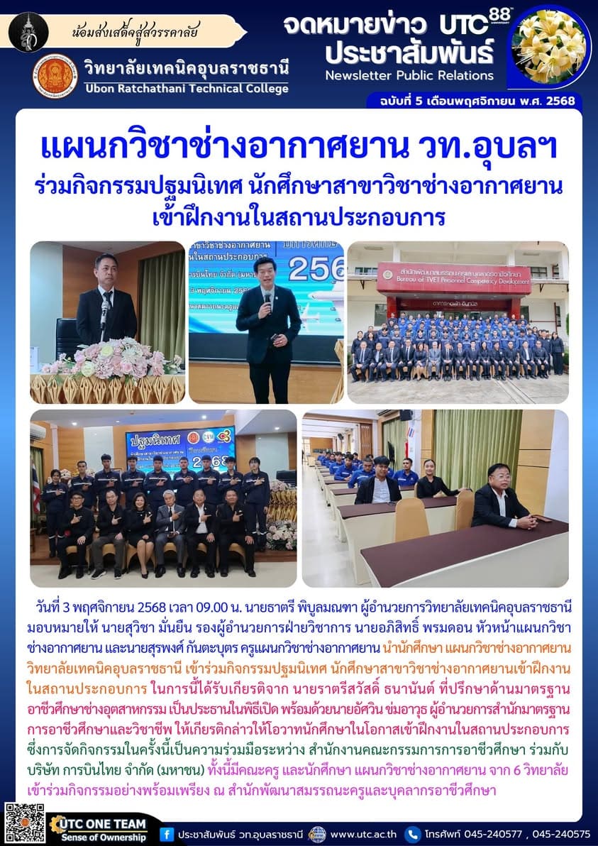 เเผนกวิชาช่างอากาศยาน วท.อุบลฯ เข้าร่วมกิจกรรมปฐมนิเทศ นักศึกษาสาขาวิชาช่างอากาศยานเข้าฝึกงานในสถานประกอบการ