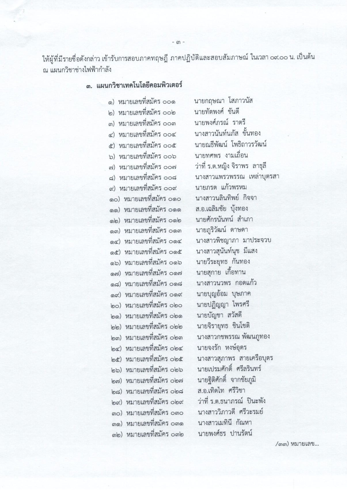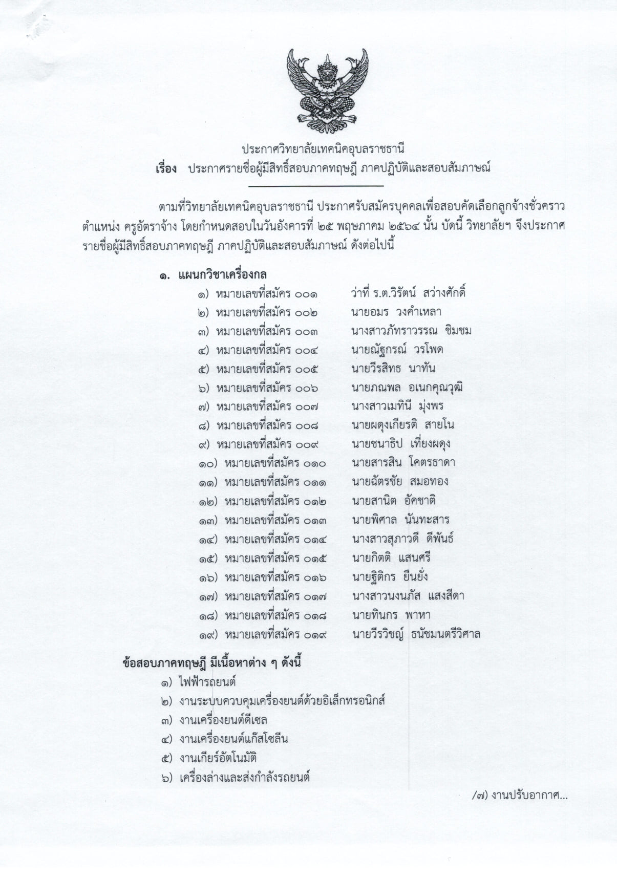 เรื่อง ประกาศรายชื่อผู้มีสิทธิ์สอบภาคทฤษฎี ภาคปฏิบัติและสอบสัมภาษณ์