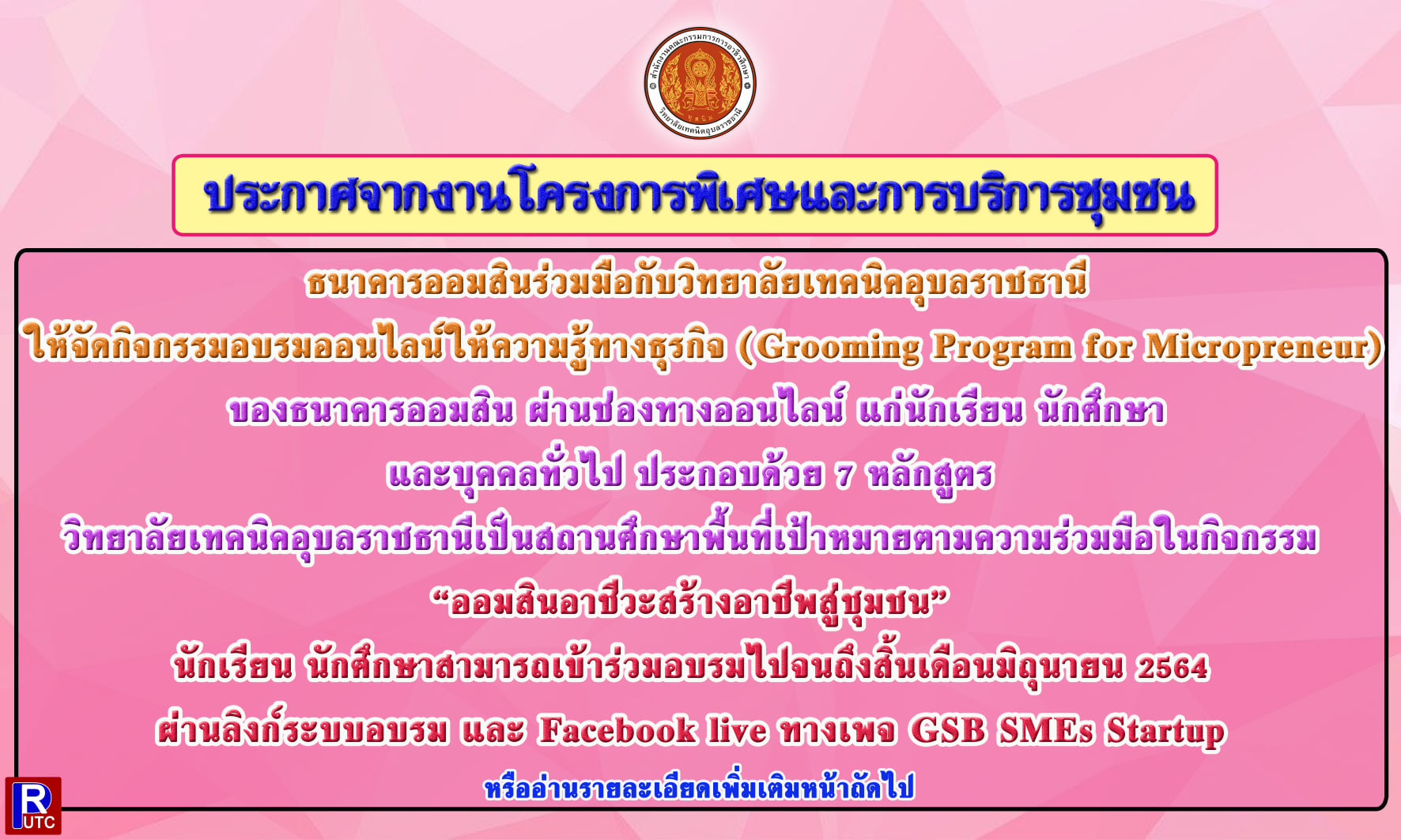 ธนาคารออมสินร่วมมือกับวิทยาลัยเทคนิคอุบลราชธานี ให้จัดกิจกรรมอบรมออนไลน์ให้ความรู้ทางธุรกิจ (เพิ่มเติม…)