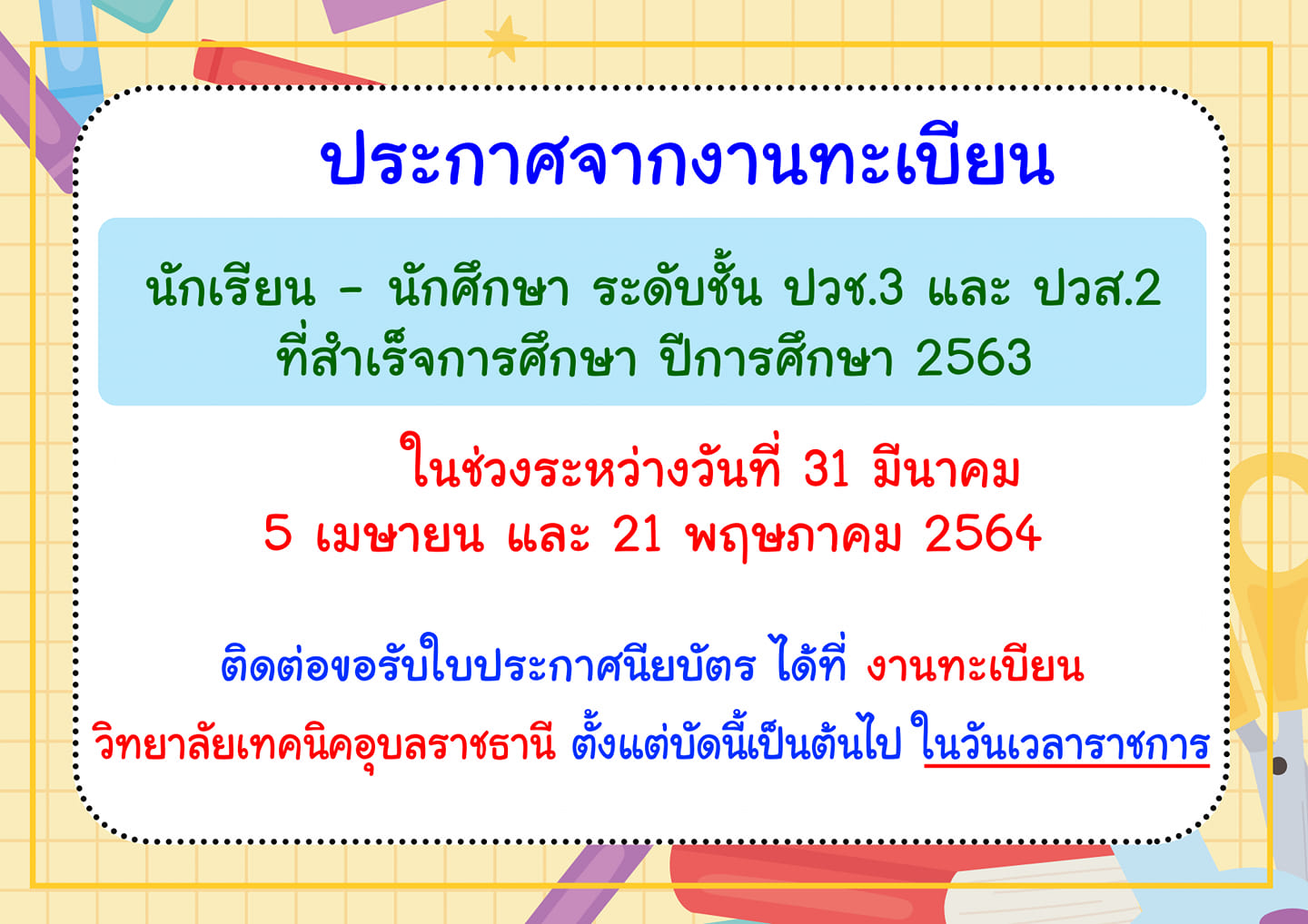 นักเรียน – นักศึกษา ระดับชั้น ปวช.3 และ ปวส.2 ที่สำเร็จการศึกษา ปีการศึกษา 2563 ในช่วงระหว่างวันที่ 31 มีนาคม (เพิ่มเติม…)