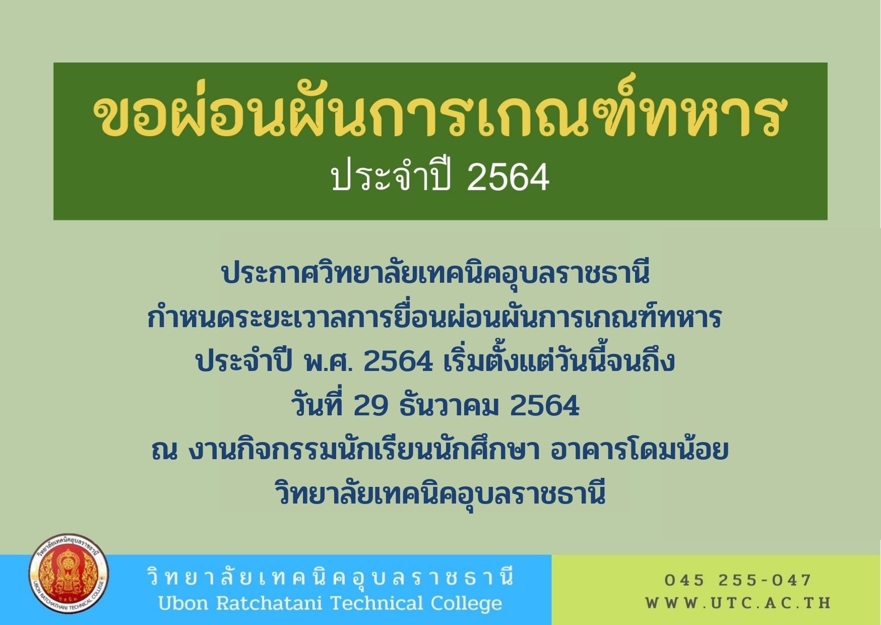 ประกาศวิทยาลัยเทคนิคอุบลราชธานี กำหนดระยะเวาลการยื่อนผ่อนผันการ (เพิ่มเติม…)