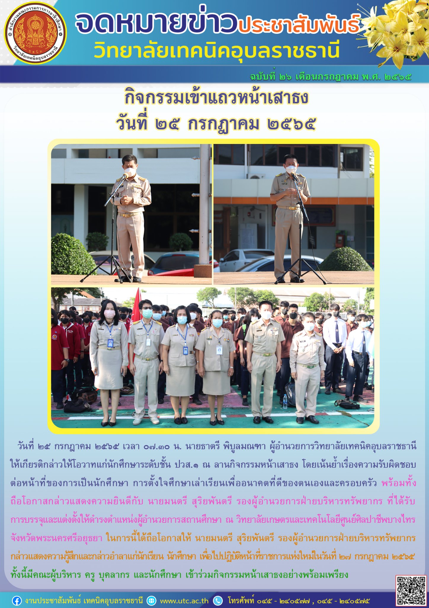 วันที่ ๒๕ กรกฎาคม ๒๕๖๕ เวลา ๐๗.๓๐ น. นายธาตรี พิบูลมณฑา ผู้อำนวยการวิทยาลัยเทคนิคอุบลราชธานี ให้เกียรติกล่าวให้โอวาทแก่นักศึกษาระดับชั้น ปวส.๑ ณ ลานกิจกรรม (เพิ่มเติม…)
