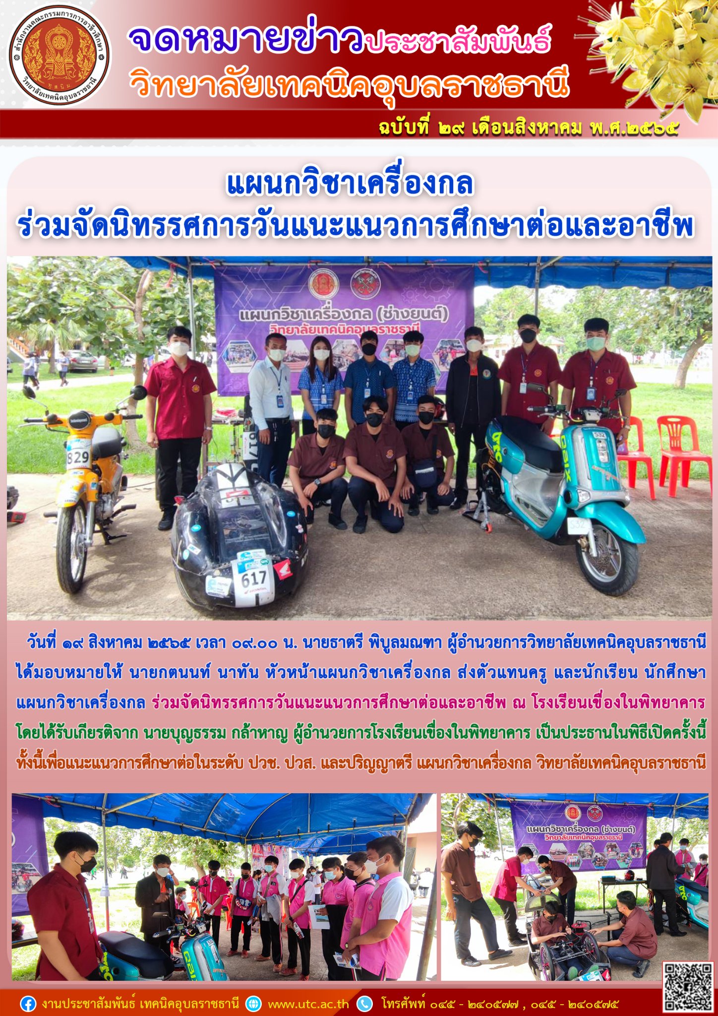 วันที่ ๑๗ สิงหาคม ๒๕๖๕ เวลา ๐๘.๓๐ น. นายธาตรี พิบูลมณฑา ผู้อำนวยการวิทยาลัยเทคนิคอุบลราชธานี (เพิ่มเติม…)
