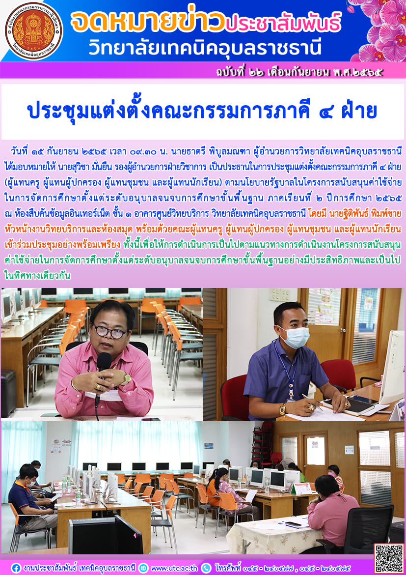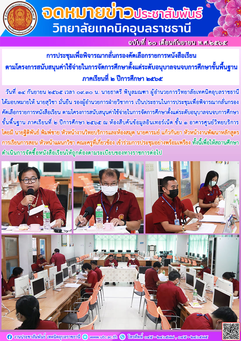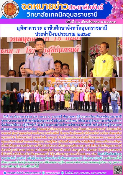 วันที่ ๑๔ กันยายน ๒๕๖๕ เวลา ๐๘.๓๐ น. นายธาตรี พิบูลมณฑา ผู้อำนวยการวิทยาลัยเทคนิคอุบลราชธานี (เพิ่มเติม…)