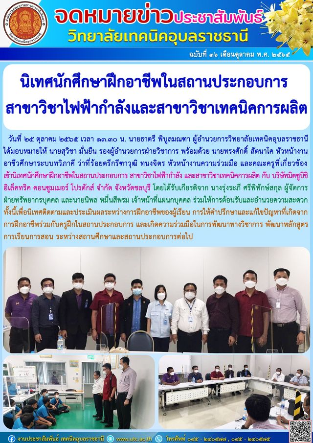วันที่ ๒๖ ตุลาคม ๒๕๖๕ เวลา ๐๙.๐๐ น. นายธาตรี พิบูลมณฑา ผู้อำนวยการวิทยาลัยเทคนิคอุบลราชธานี (เพิ่มเติม…)