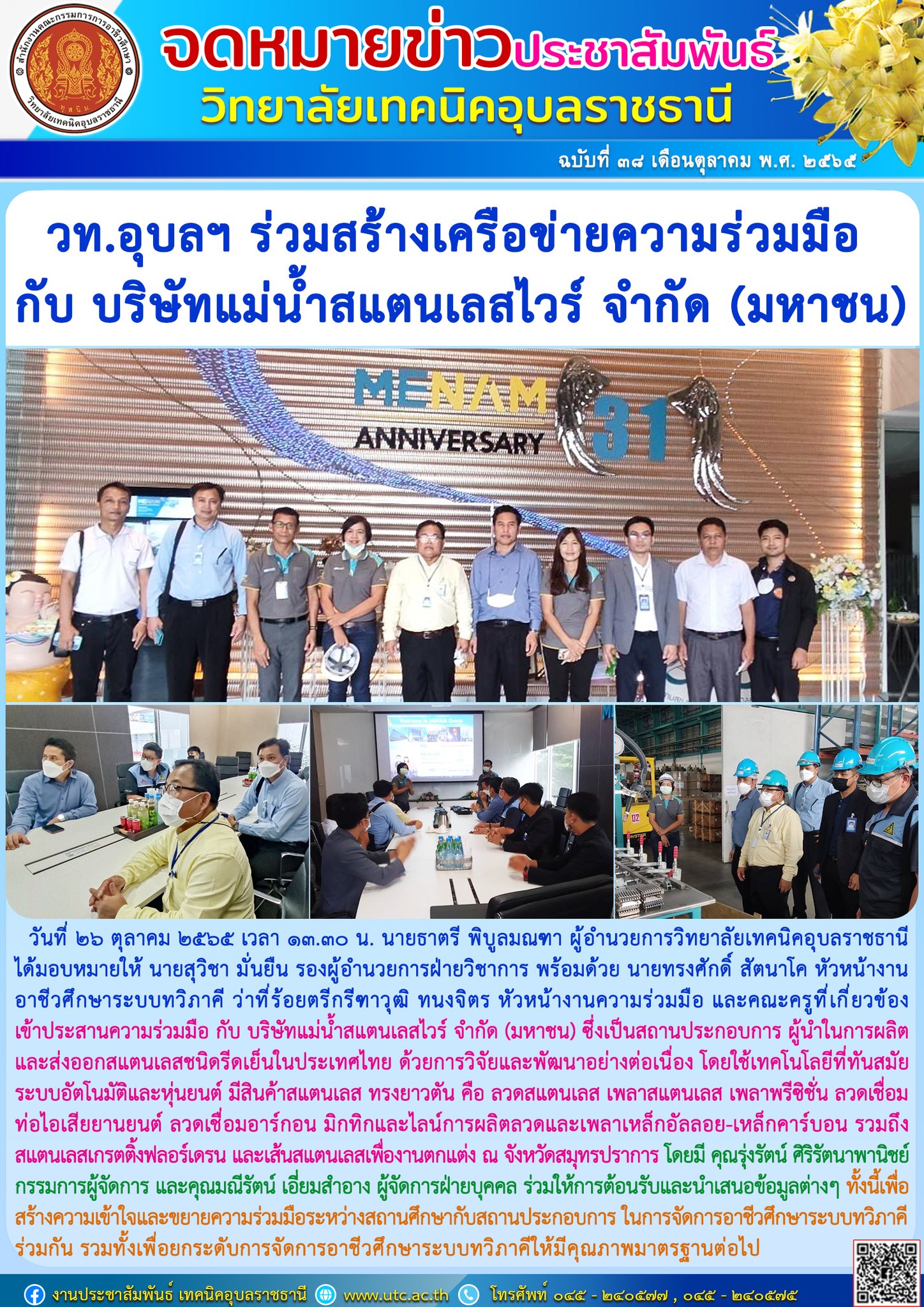 วท.อุบลฯ ร่วมสร้างเครือข่ายความร่วมมือกับ บริษัทแม่น้ำสแตนเลสไวร์ จำกัด (มหาชน)