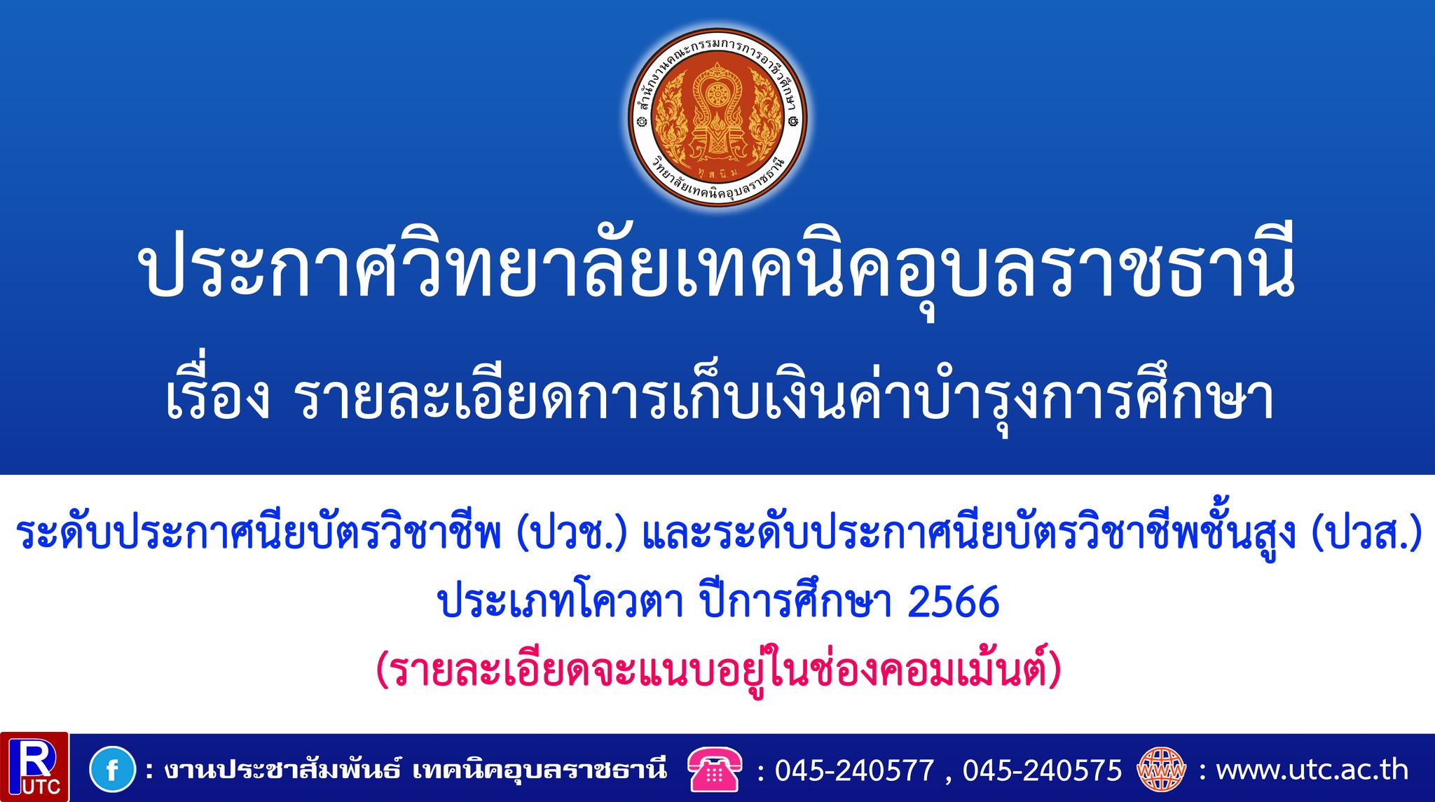 ประกาศวิทยาลัยเทคนิคอุบลราชธานี เรื่อง รายละเอียดการเก็บเงินค่าบำรุงการศึกษา ระดับประกาศนียบัตรวิชาชีพ (ปวช.) และระดับประกาศ (เพิ่มเติม…)