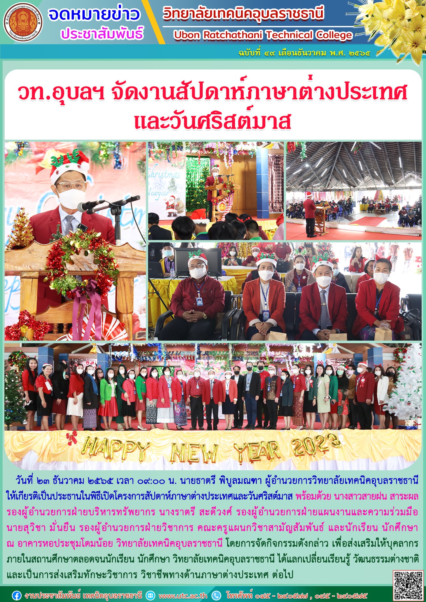 วันที่ ๒๓ ธันวาคม ๒๕๖๕ เวลา ๐๙:๐๐ น. นายธาตรี พิบูลมณฑา ผู้อำนวยการวิทยาลัยเทคนิคอุบลราชธานี ให้เกียรติเป็นประธานในพิธีเปิดโครงการสัปดาห์ภาษาต่างประเทศและวันศริสต์มาส พร้อมด้วย นางสาวสายฝน (เพิ่มเติม…)