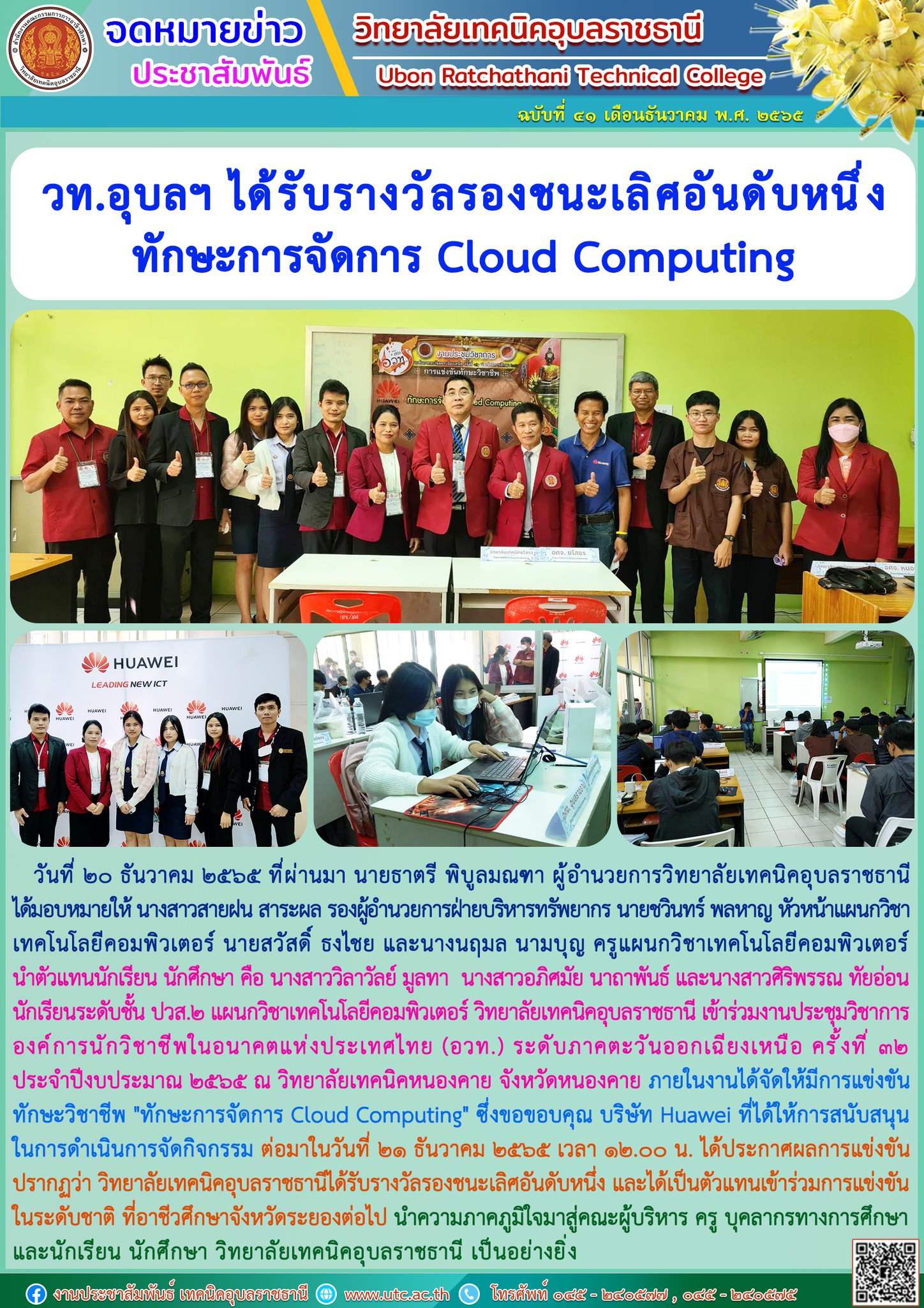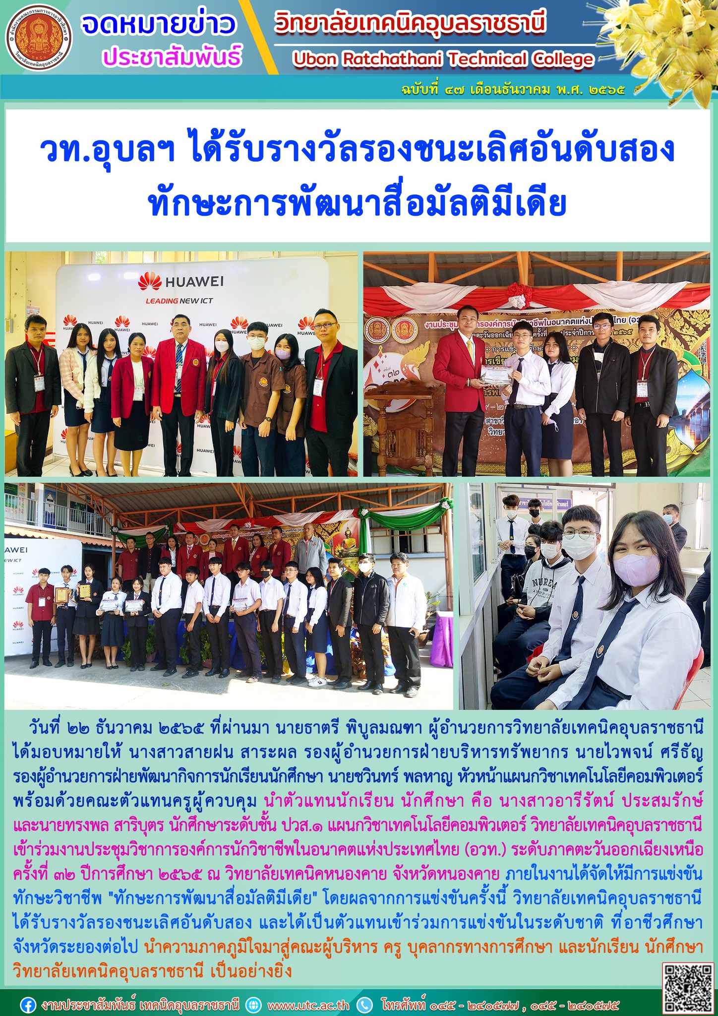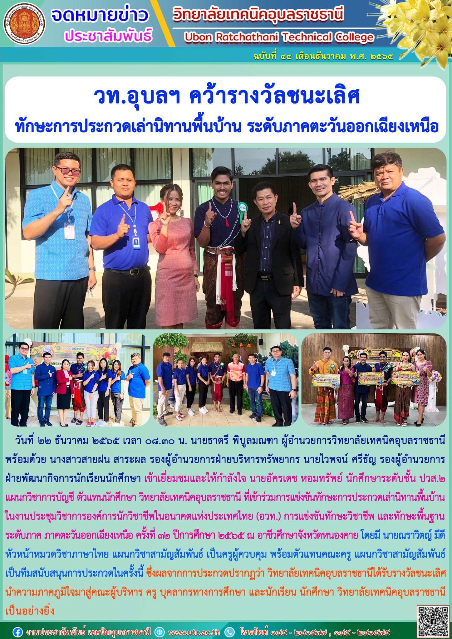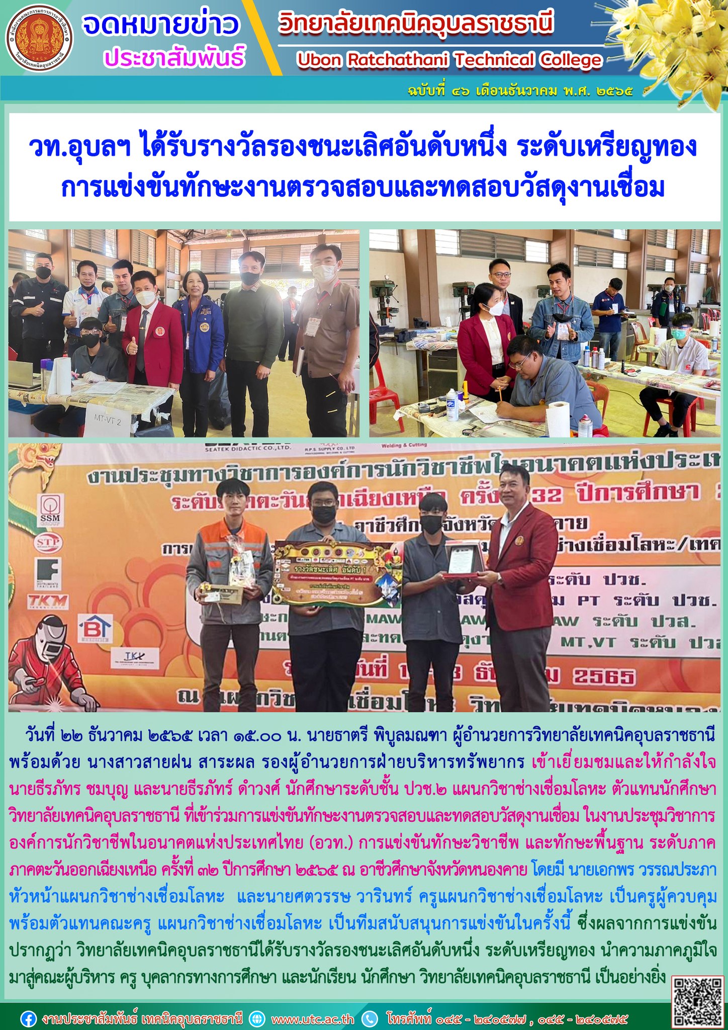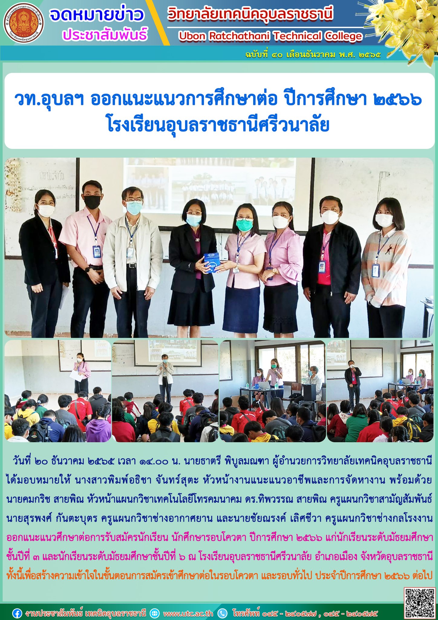 วันที่ ๒๒ ธันวาคม ๒๕๖๕ เวลา ๑๕.๐๐ น. นายธาตรี พิบูลมณฑา ผู้อำนวยการวิทยาลัยเทคนิคอุบลราชธานี พร้อมด้วย นางสาวสายฝน สาระผล (เพิ่มเติม…)
