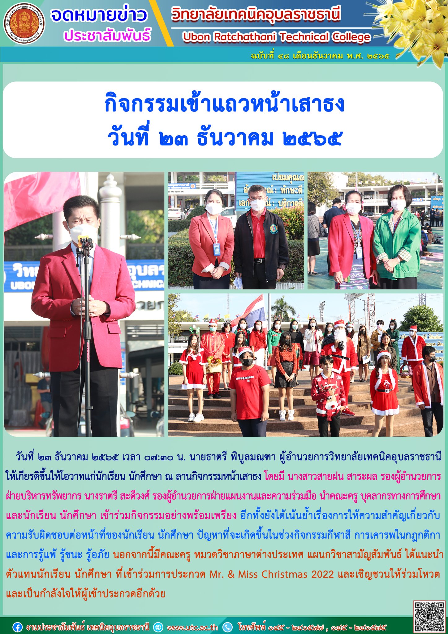 วันที่ ๒๓ ธันวาคม ๒๕๖๕ เวลา ๐๗:๓๐ น. นายธาตรี พิบูลมณฑา ผู้อำนวยการวิทยาลัยเทคนิคอุบลราชธานี ให้เกียรติขึ้นให้โอวาทแก่นักเรียน นักศึกษา ณ ลานกิจกรรมหน้าเสาธง โดยมี นางสาวสายฝน สาระผล รองผู้อำนวยการฝ่ายบริหาร (เพิ่มเติม…)