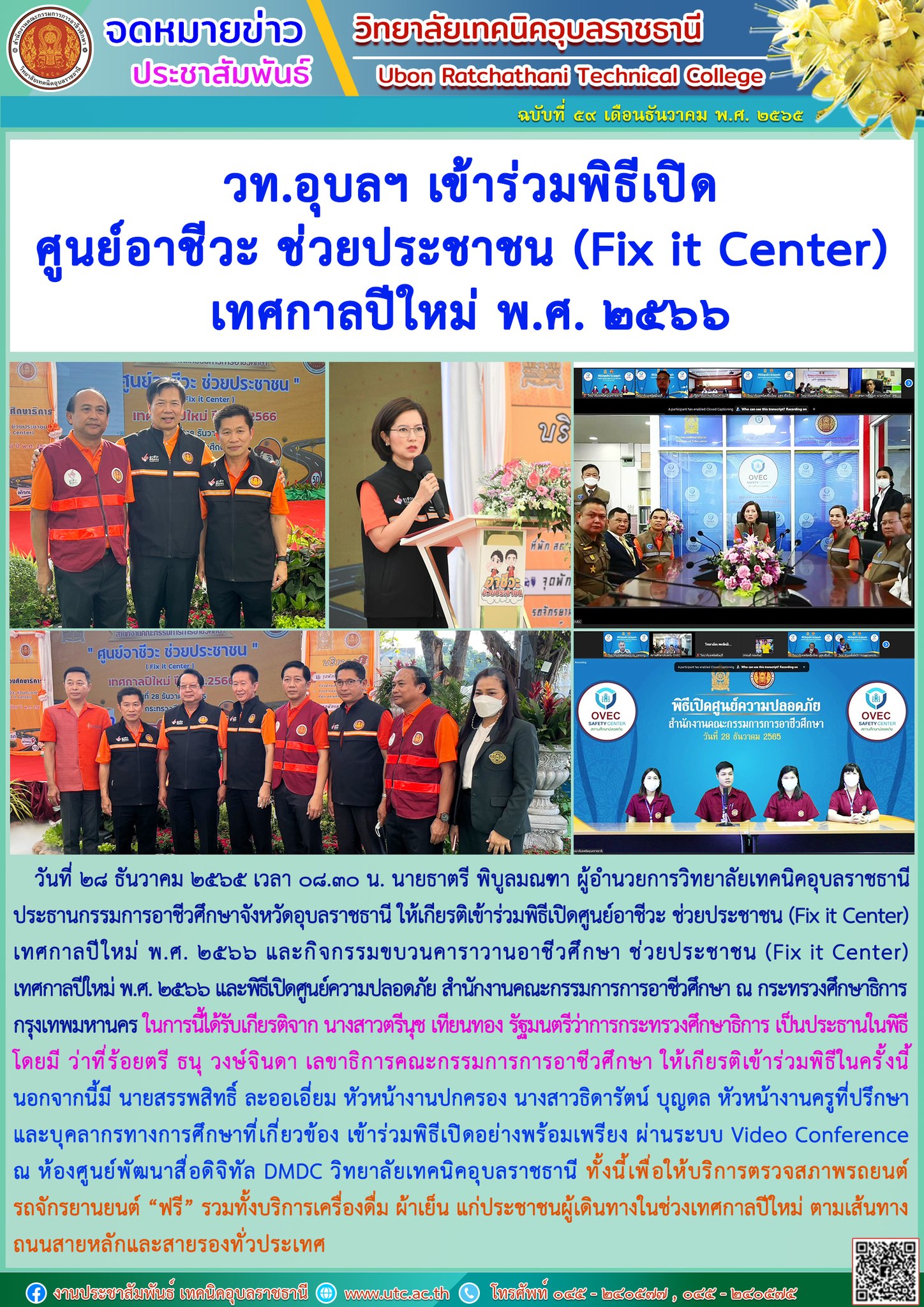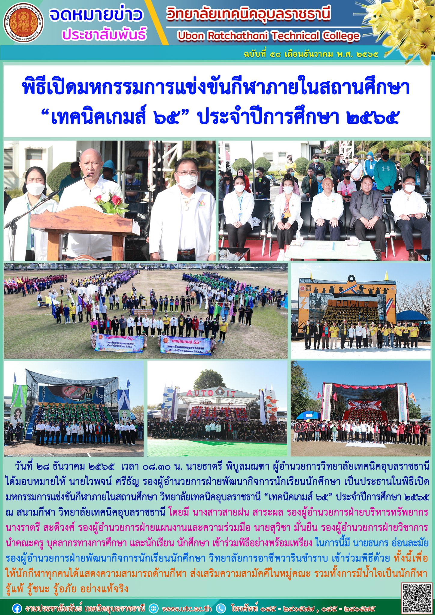 วันที่ ๒๘ ธันวาคม ๒๕๖๕ เวลา ๐๘.๓๐ น. นายธาตรี พิบูลมณฑา ผู้อำนวยการวิทยาลัยเทคนิคอุบลราชธานี ประธานกรรมการอาชีวศึกษา (เพิ่มเติม…)