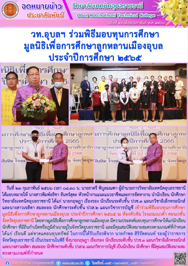 วันที่ ๒๓ กุมภาพันธ์ ๒๕๖๖ เวลา ๐๘.๓๐ น. นายธาตรี พิบูลมณฑา ผู้อำนวยการวิทยาลัยเทคนิคอุบลราชธานี ได้มอบหมายให้ นางสาว (เพิ่มเติม…)