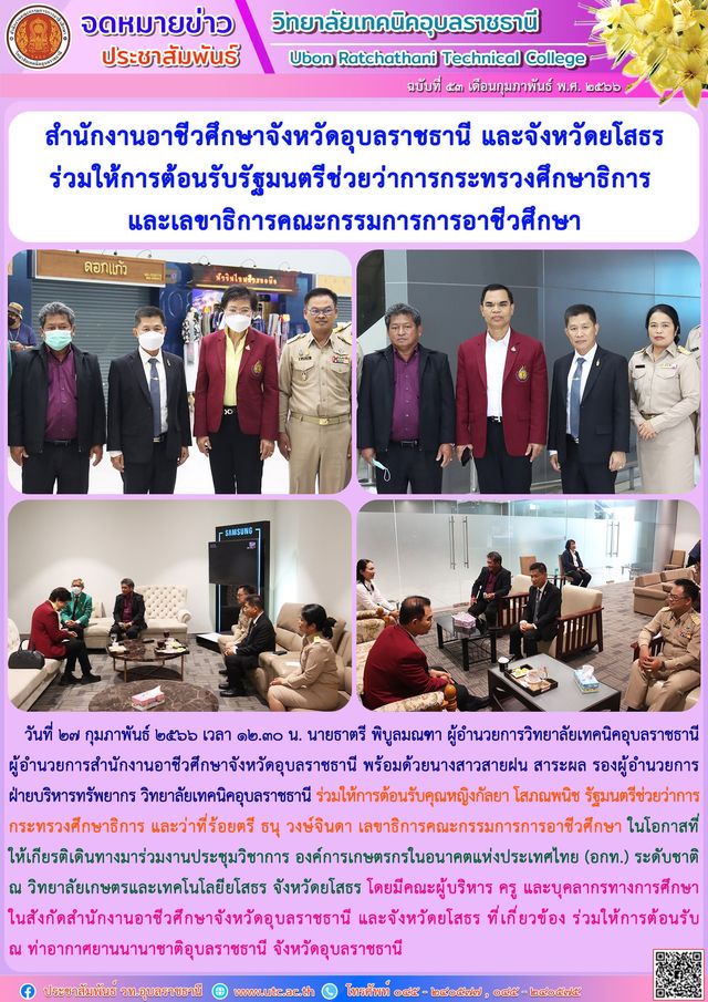 ในสังกัดสำนักงานอาชีวศึกษาจังหวัดอุบลราชธานี และจังหวัดยโสธร ร่วมให้การต้อนรับรัฐมนตรีช่วยว่าการกระทรวงศึกษาธิการ และเลขาธิการคณะกรรมการการอาชีวศึกษา