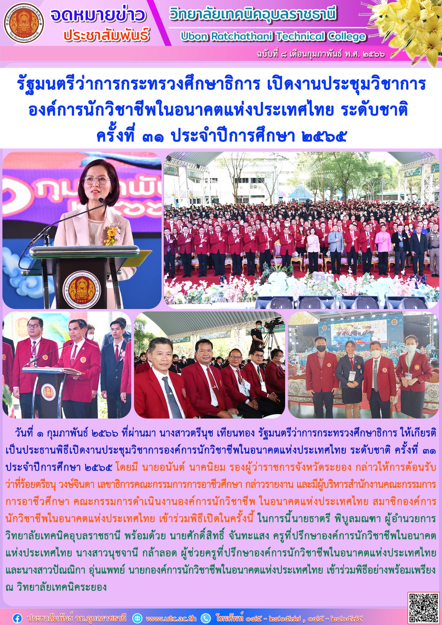 วันที่ ๑ กุมภาพันธ์ ๒๕๖๖ เวลา ๐๙.๓๐ น. นายธาตรี พิบูลมณฑา ผู้อำนวยการวิทยาลัยเทคนิคอุบล (เพิ่มเติม…)