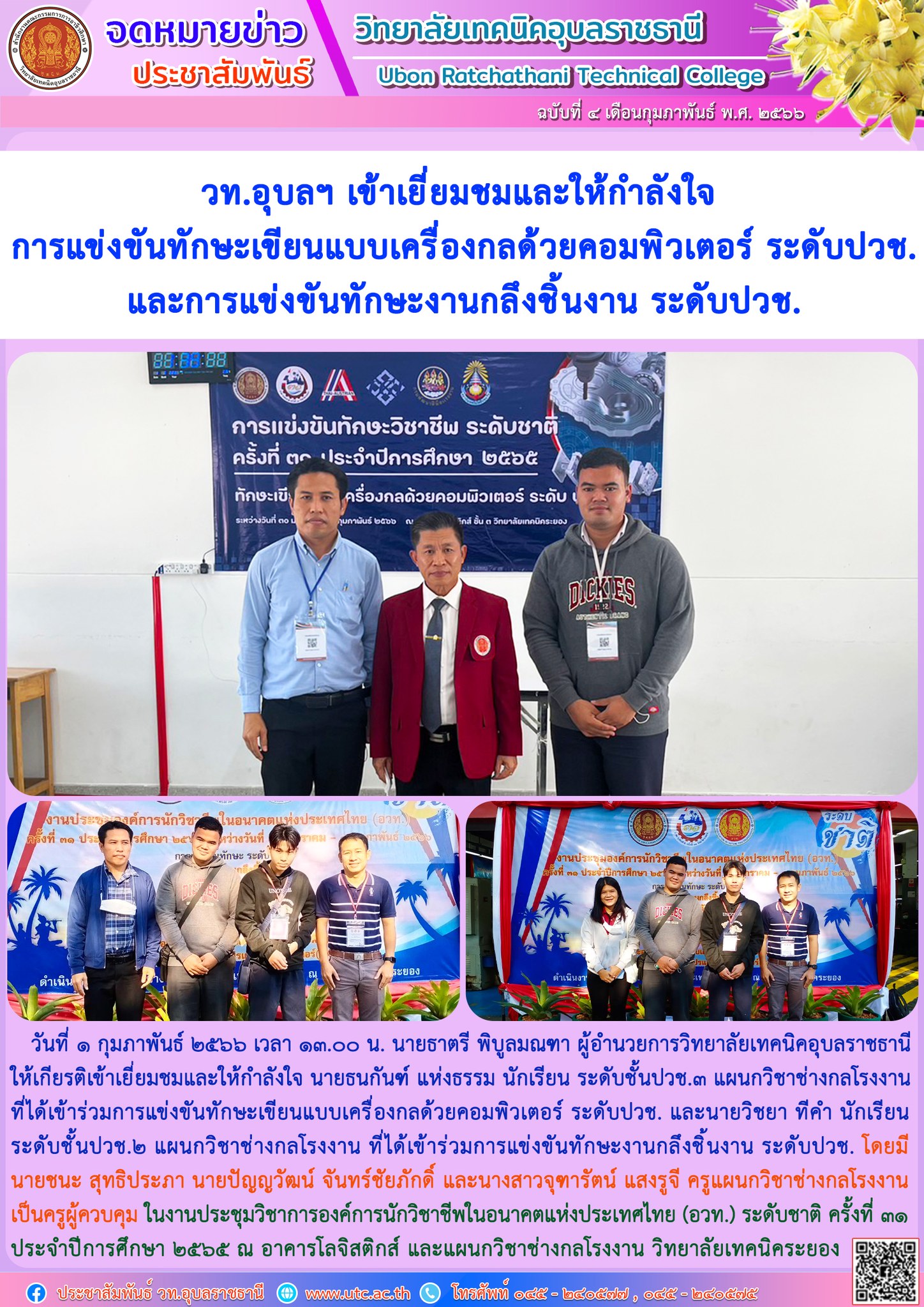 วันที่ ๑ กุมภาพันธ์ ๒๕๖๖ เวลา ๑๔.๓๐ น. นายธาตรี พิบูลมณฑา ผู้อำนวยการวิทยาลัยเทคนิคอุบลราชธานี ให้เกียรติเข้าเยี่ยมชมและให้กำลังใจ (เพิ่มเติม…)
