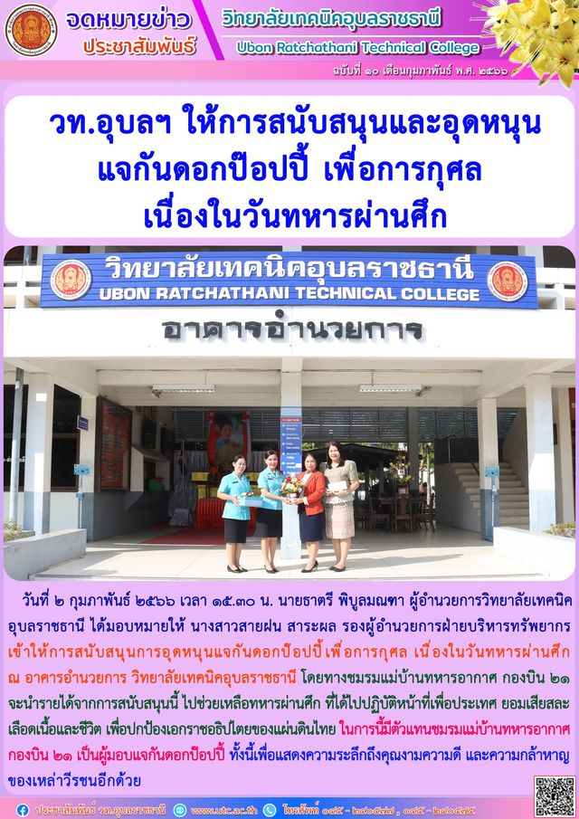 วท.อุบลฯ ให้การสนับสนุนการอุดหนุนแจกันดอกป๊อปปี้เพื่อการกุศล เนื่องในวันทหารผ่านศึก