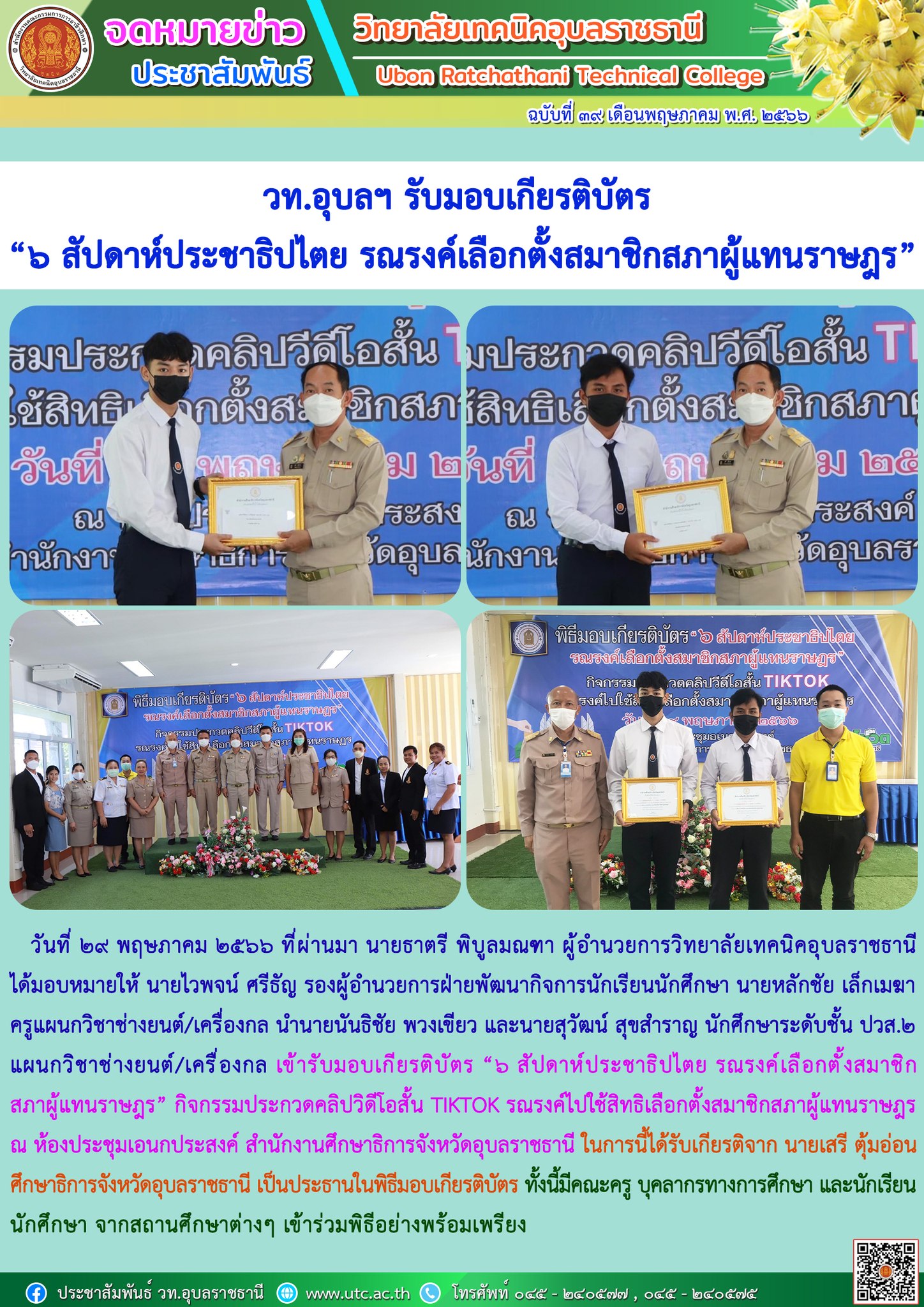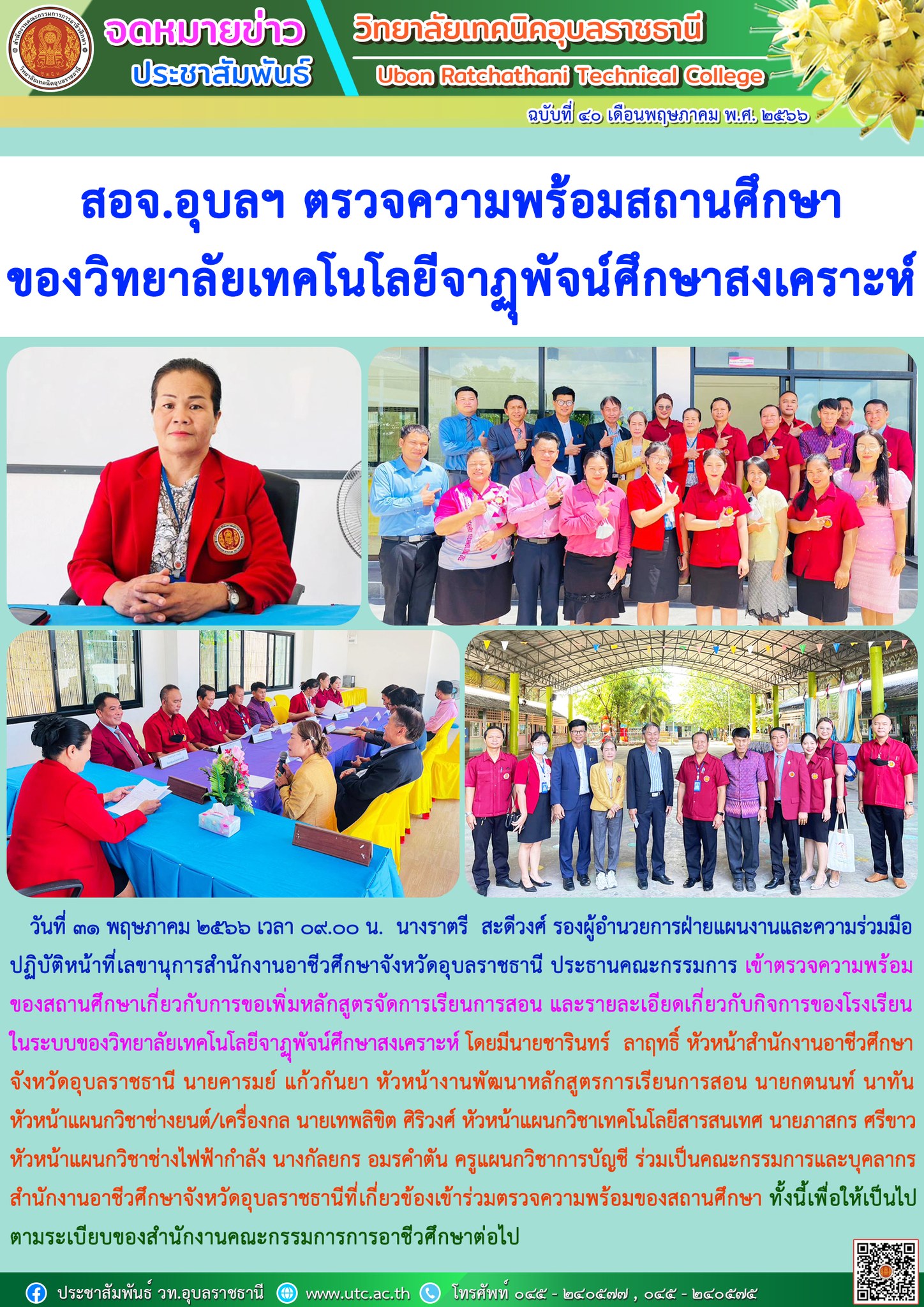 วันที่ ๒๙ พฤษภาคม ๒๕๖๖ ที่ผ่านมา นายธาตรี พิบูลมณฑา ผู้อำนวยการวิทยาลัยเทคนิคอุบลราชธานี (เพิ่มเติม…)
