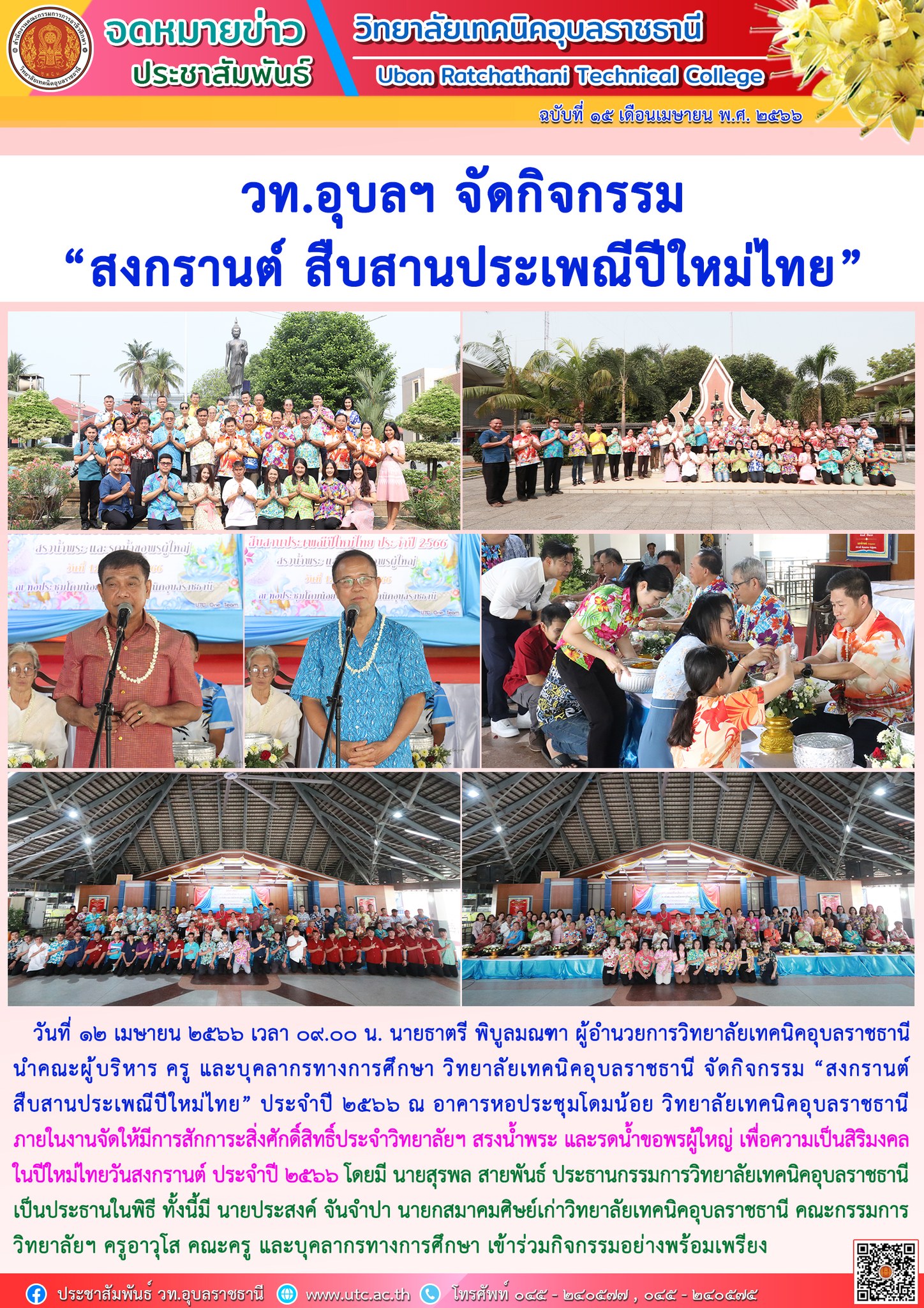 วันที่ ๑๒ เมษายน ๒๕๖๖ เวลา ๐๙.๐๐ น. นายธาตรี พิบูลมณฑา ผู้อำนวยการวิทยาลัยเทคนิคอุบลราชธานี นำคณะผู้บริหาร ครู และบุคลากรทางการศึกษา วิทยาลัยเทคนิค (เพิ่มเติม…)