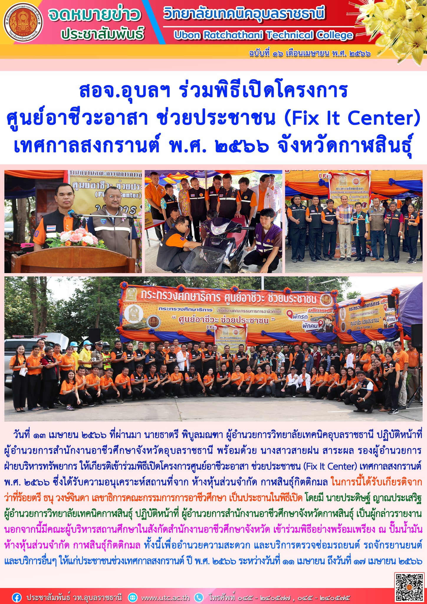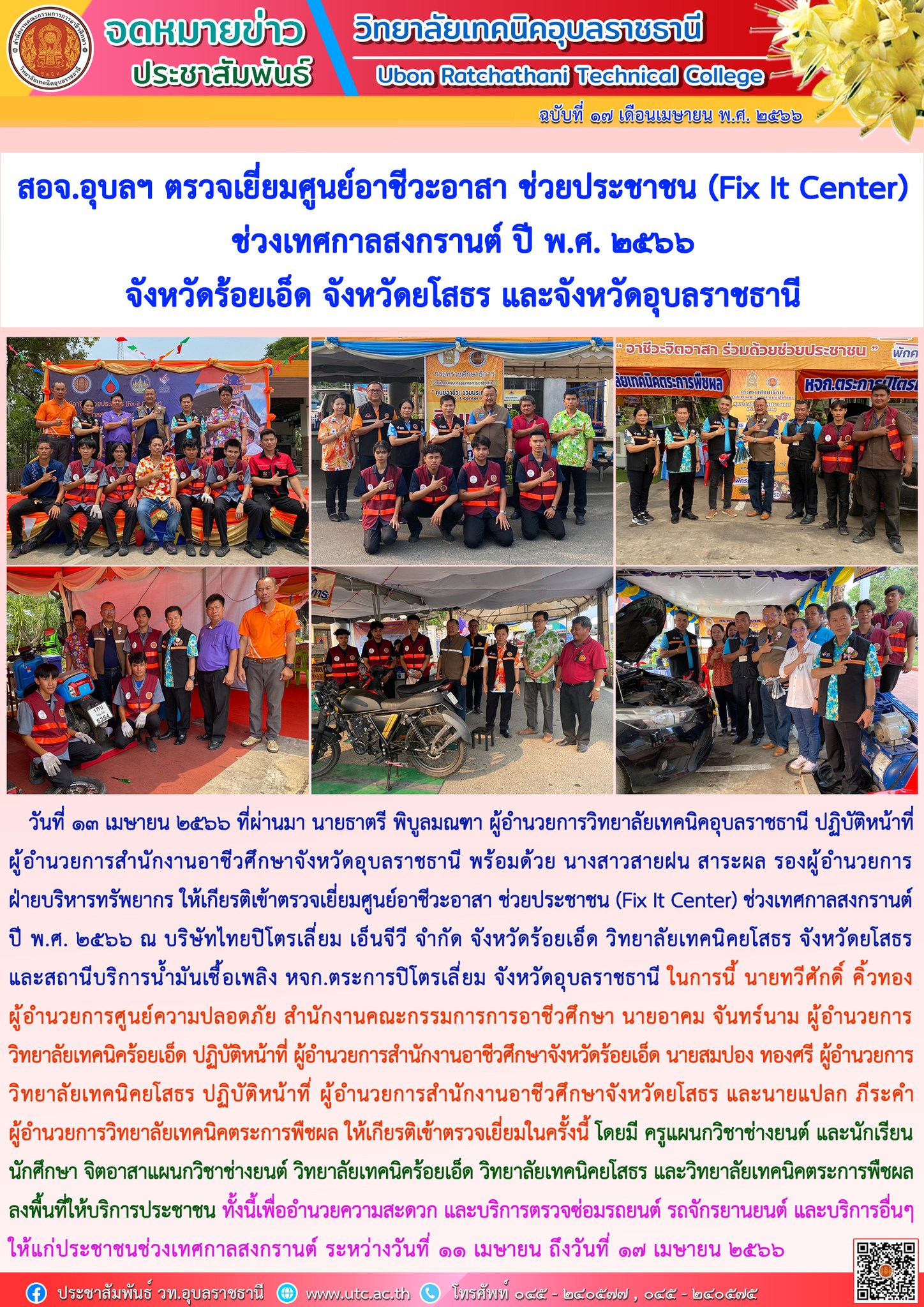 ตรวจเยี่ยมศูนย์อาชีวะอาสา ช่วยประชาชน (Fix It Center) ช่วงเทศกาลสงกรานต์ ปี พ.ศ. ๒๕๖๖ จังหวัดร้อยเอ็ด จังหวัดยโสธร จังหวัดอุบลราชธานี
