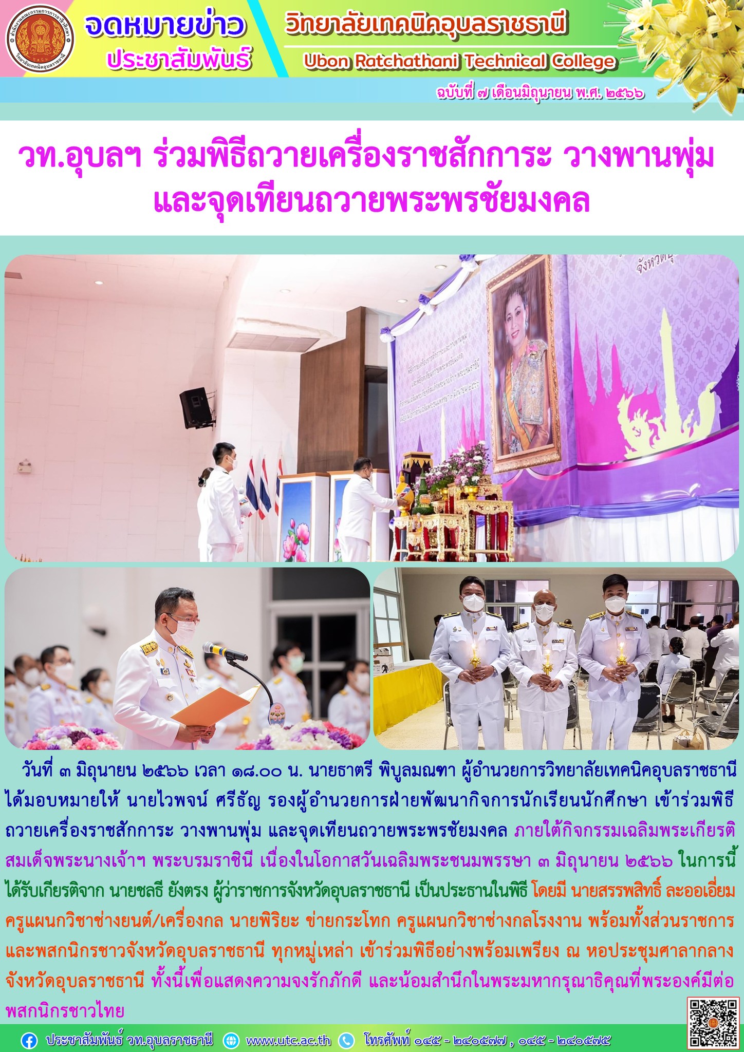วันที่ ๓ มิถุนายน ๒๕๖๖ เวลา ๑๘.๐๐ น. นายธาตรี พิบูลมณฑา ผู้อำนวยการวิทยาลัยเทคนิคอุบลราชธานี ได้มอบหมายให้ นายไวพจน์ ศรีธัญ รองผู้อำนวยการฝ่ายพัฒนากิจการนักเรียนนักศึกษา เข้าร่วมพิธีถวาย (เพิ่มเติม…)