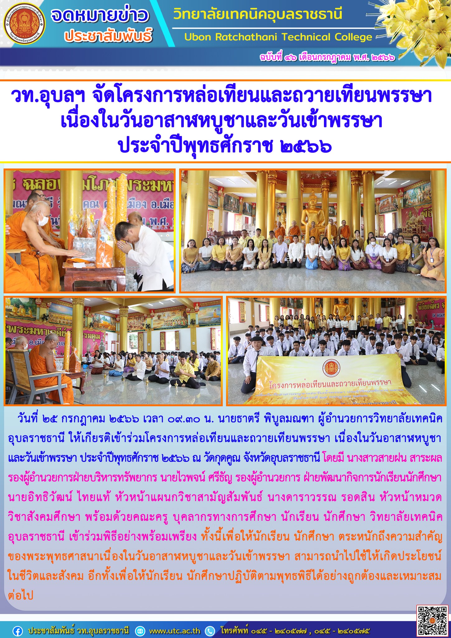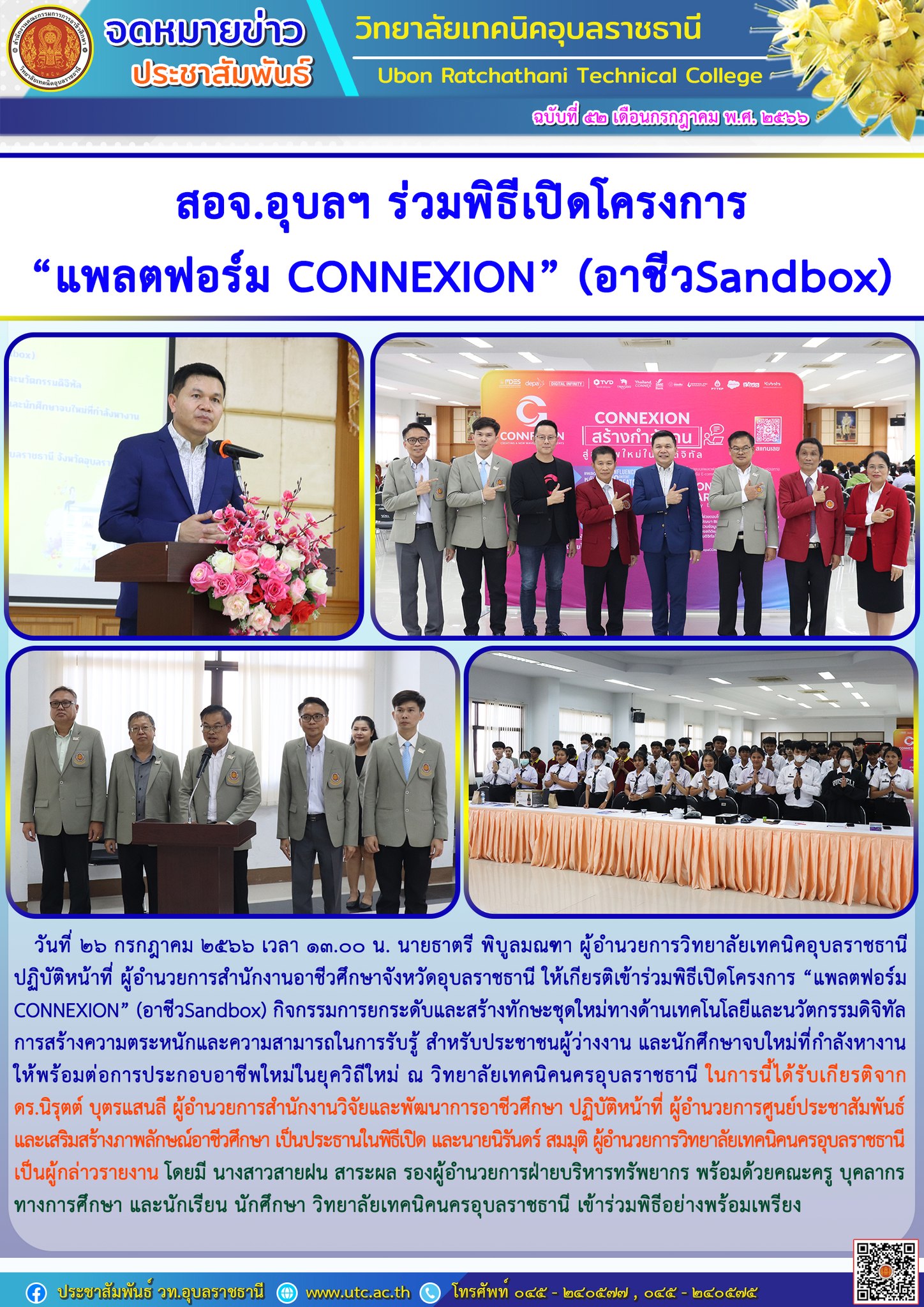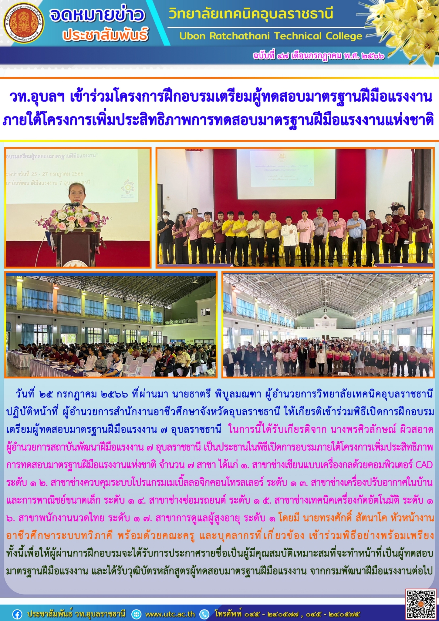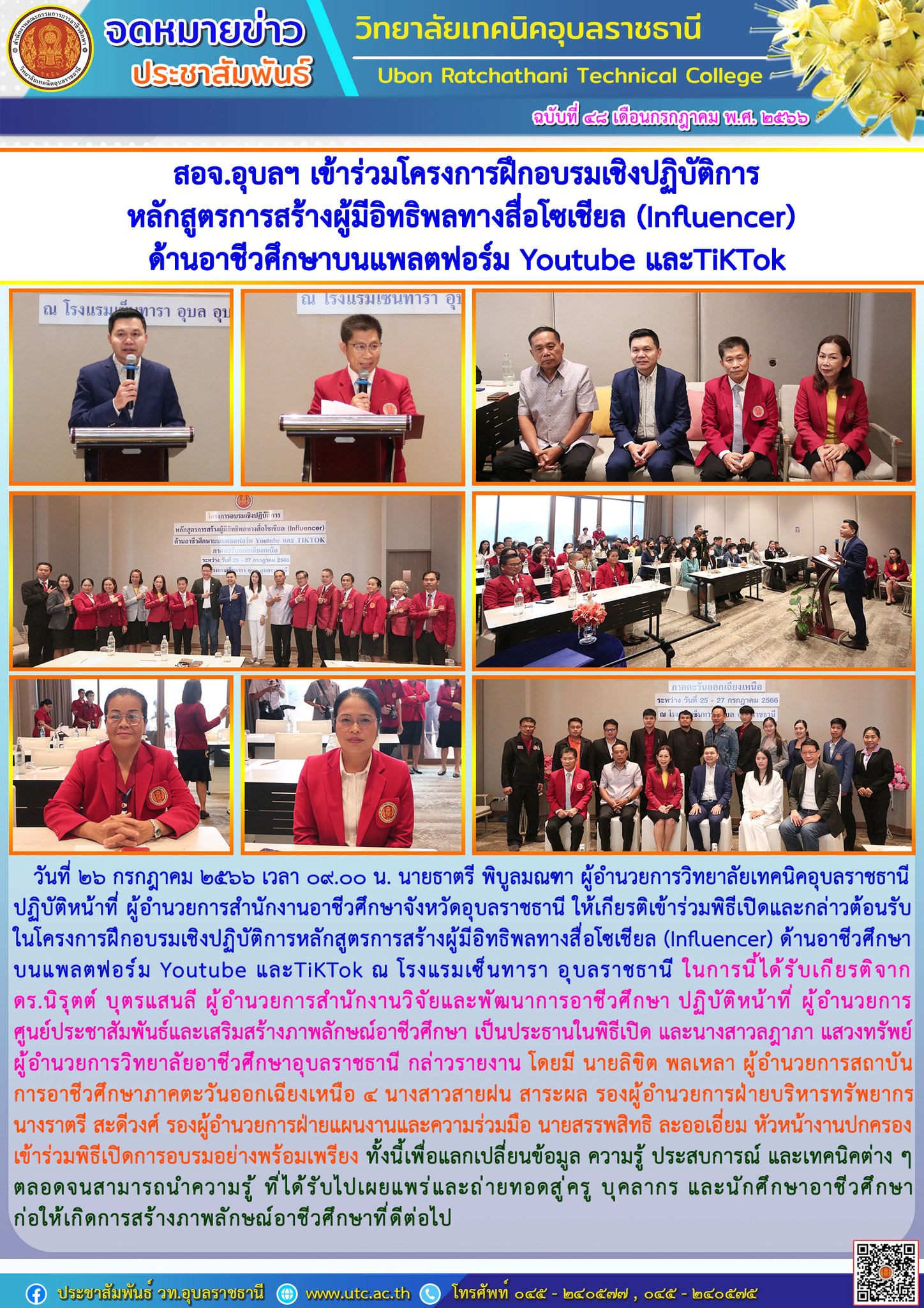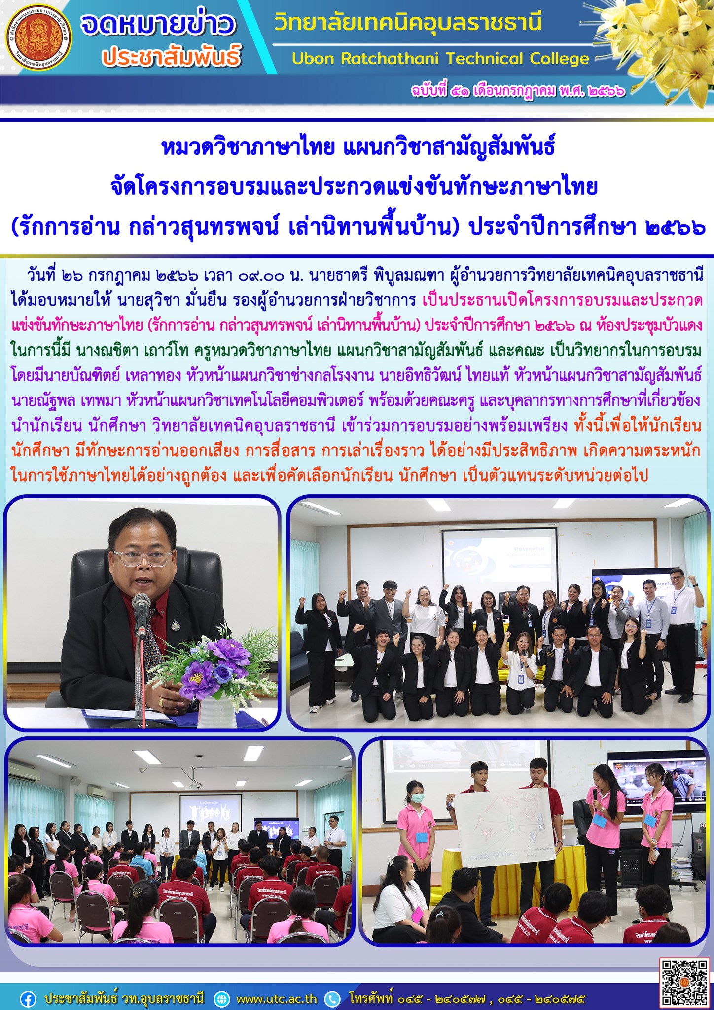 วันที่ ๒๕ กรกฎาคม ๒๕๖๖ เวลา ๐๙.๓๐ น. นายธาตรี พิบูลมณฑา ผู้อำนวยการวิทยาลัยเทคนิคอุบลราชธานี ให้เกียรติเข้าร่วมโครงการ (เพิ่มเติม…)
