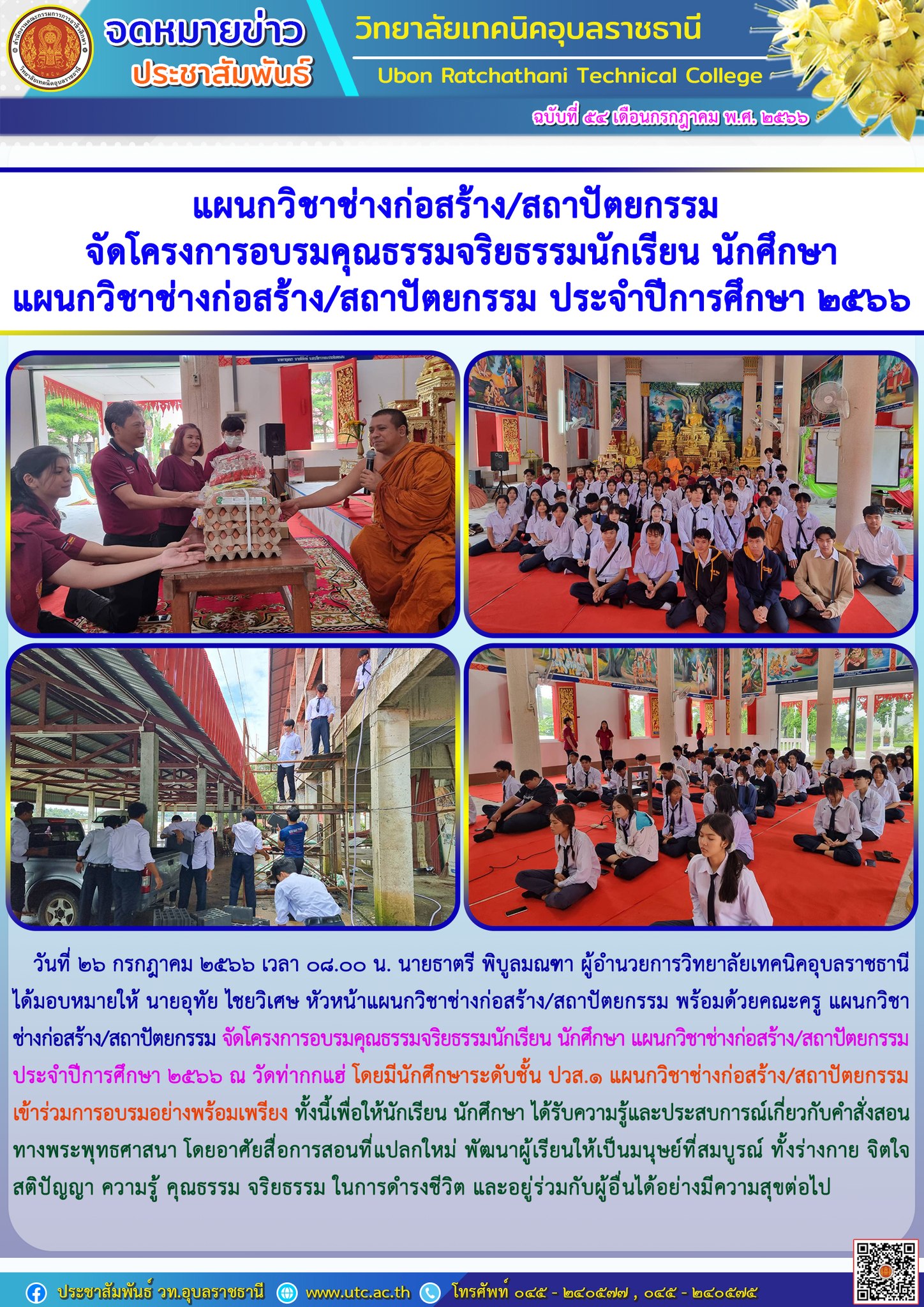 แผนกวิชาช่างก่อสร้าง/สถาปัตยกรรม จัดโครงการอบรมคุณธรรมจริยธรรมนักเรียน นักศึกษา แผนกวิชาช่างก่อสร้าง/สถาปัตยกรรม ประจำปีการศึกษา ๒๕๖๖