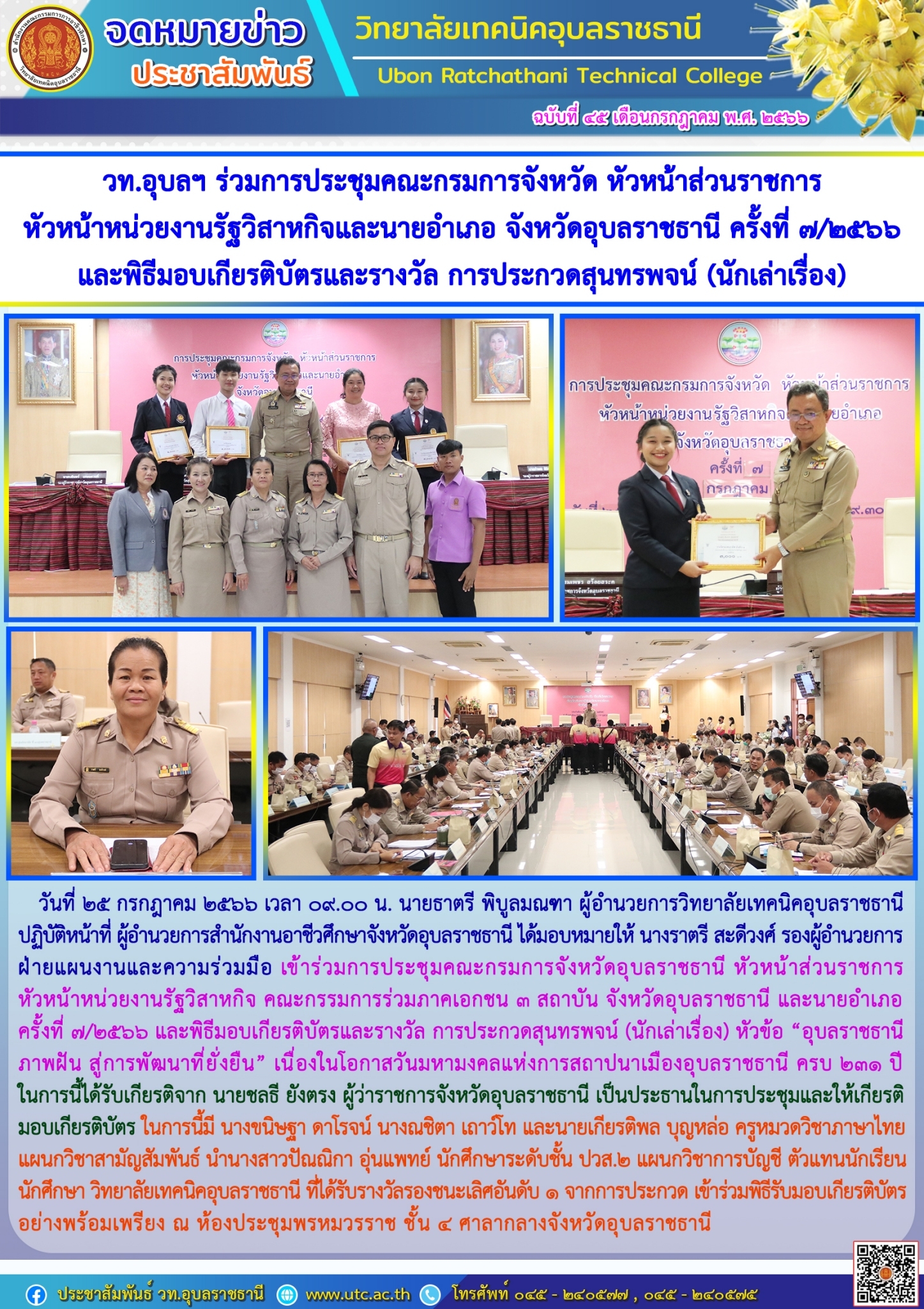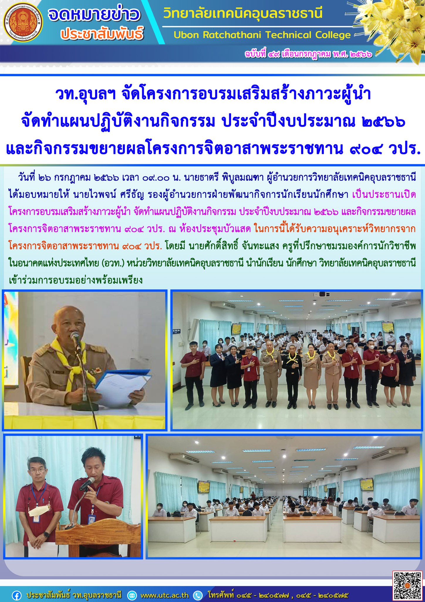 วันที่ ๒๖ กรกฎาคม ๒๕๖๖ เวลา ๐๙.๐๐ น. นายธาตรี พิบูลมณฑา ผู้อำนวยการวิทยาลัยเทคนิคอุบลราชธานี มอบหมายให้ นายเจษฎาภ (เพิ่มเติม…)