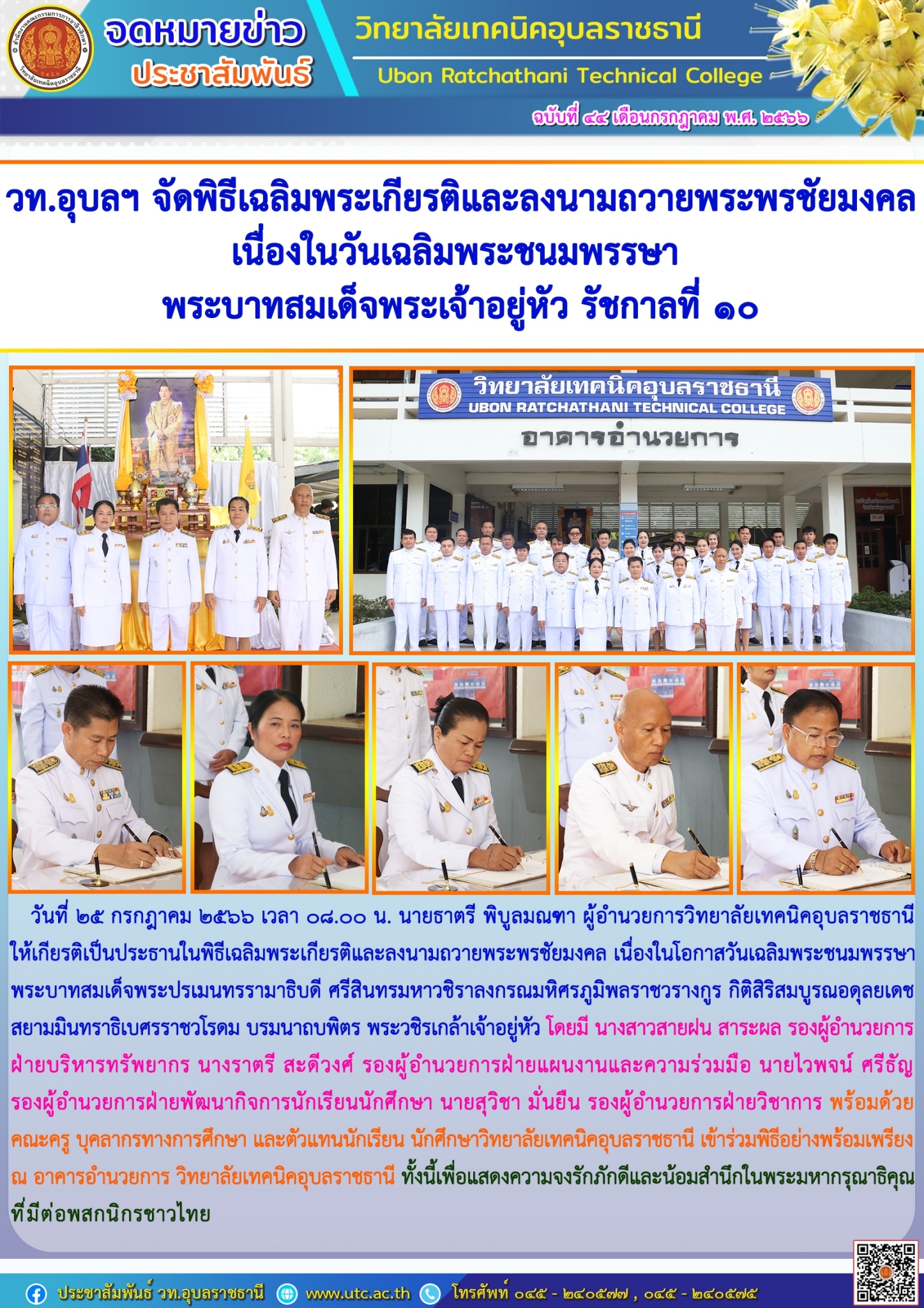 วท.อุบลฯ จัดพิธีเฉลิมพระเกียรติและลงนามถวายพระพรชัยมงคล เนื่องในวันเฉลิมพระชนมพรรษาพระบาทสมเด็จพระเจ้าอยู่หัว รัชกาลที่ 10