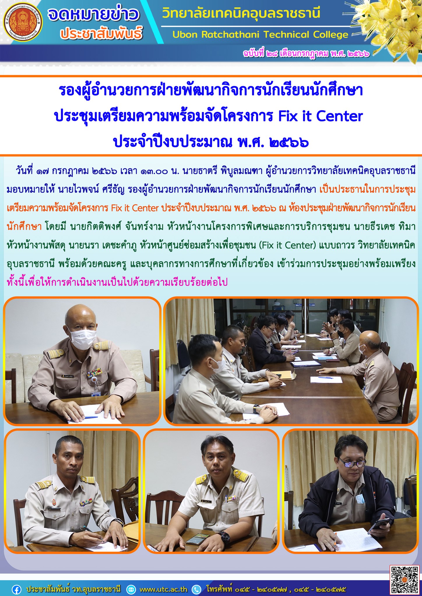 รองผู้อำนวยการฝ่ายพัฒนากิจการนักเรียน นักศึกษา ประชุมเตรียมความพร้อมจัดโครงการ Eix It Center ประจำปีงบประมาณ พ.ศ.๒๕๖๖