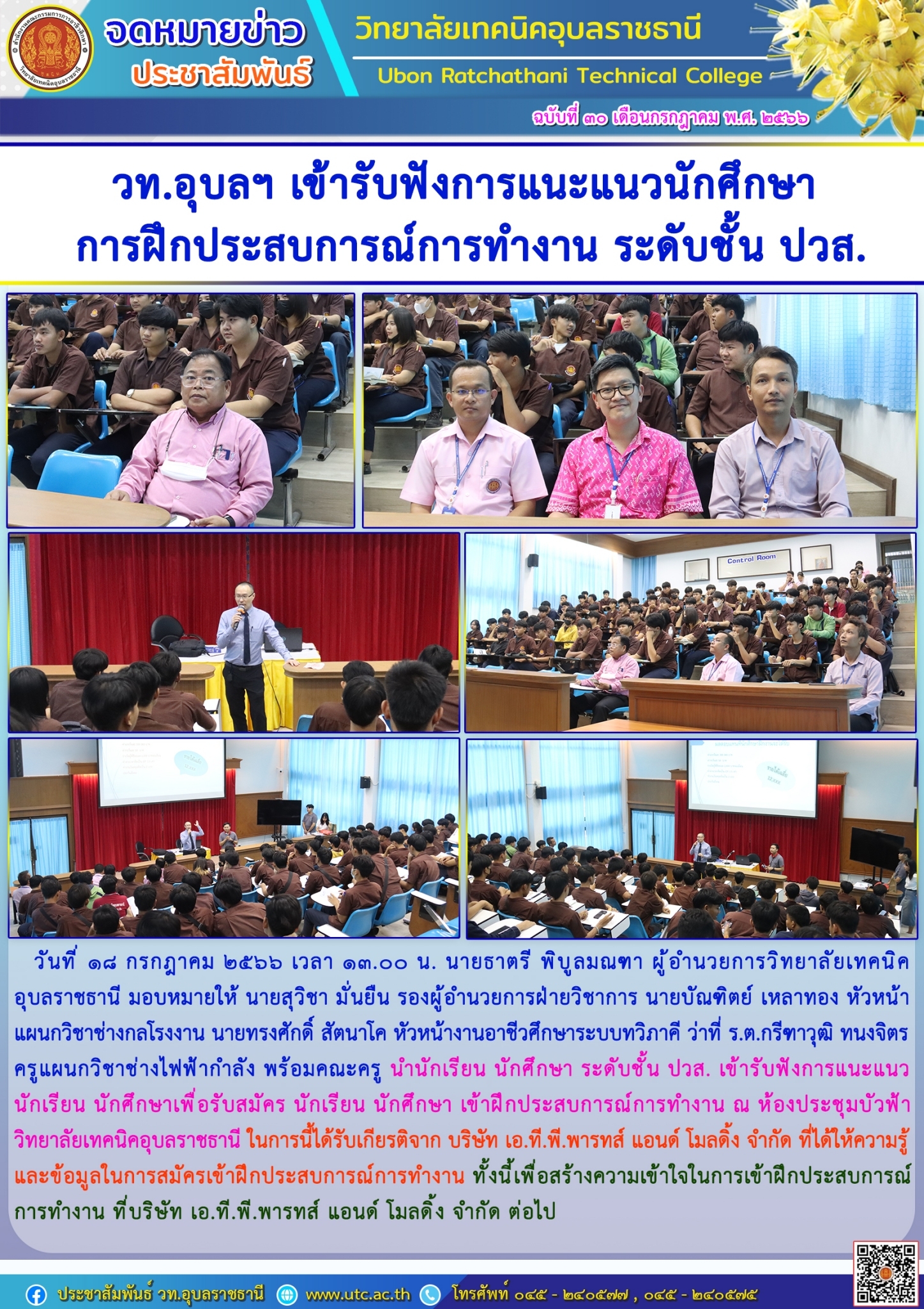 วท.อุบลฯ เข้ารับฟังการแนะแนวนักศึกษาการฝึกประสบการณ์การทำงาน ระดับชั้น ปวส.