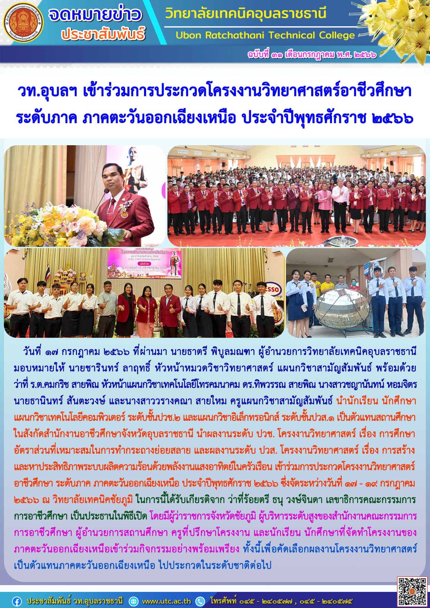 วท.อุบลฯ เข้าร่วมการประกวดโครงการวิทยาศาสตร์อาชีวศึกษาระดับภาค ภาคตะวันออกเฉียงเหนือ ประจำปีพุทธศักราช ๒๕๖๖