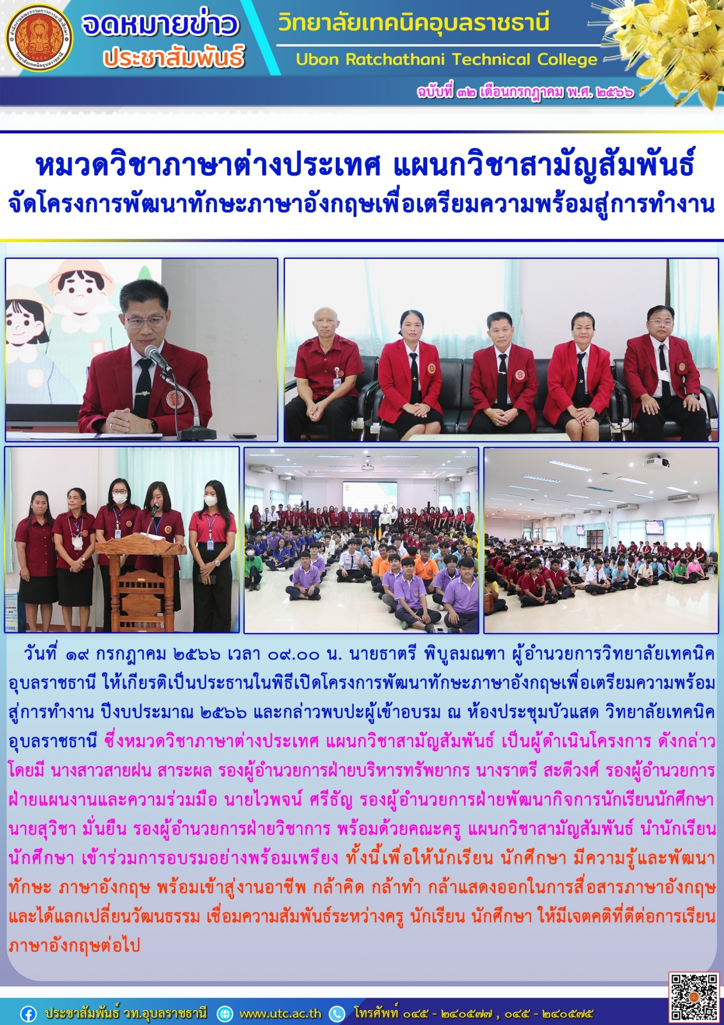 หมวดวิชาภาษต่างประเทศ แผนกวิชาสามัญสัมพันธ์ จัดโครงการพัฒนาทักษะภาษาอังกฤษเพื่อเตรียมความพร้อมสู่การทำงาน